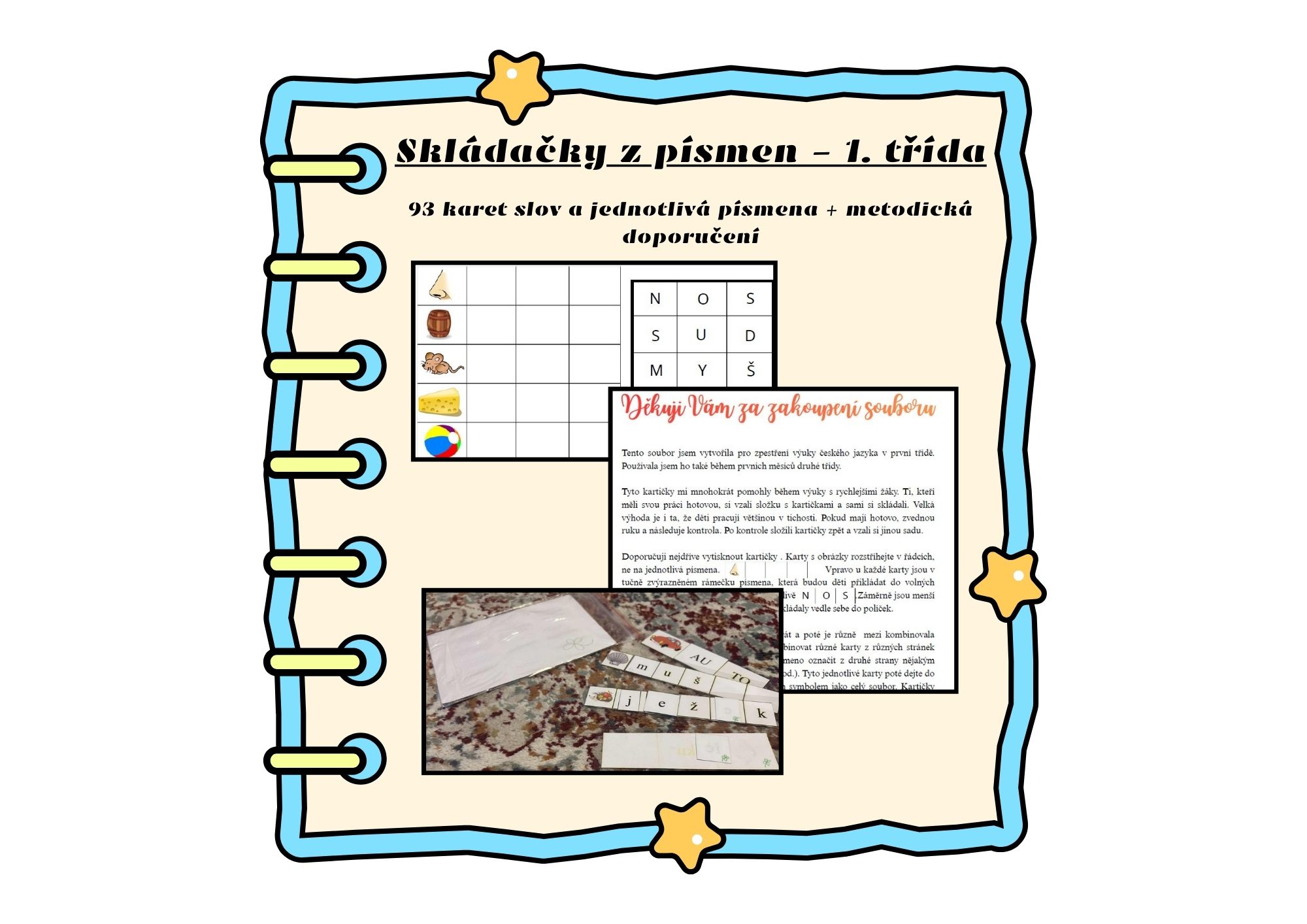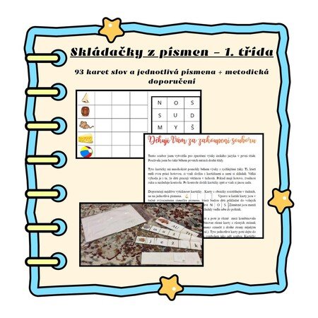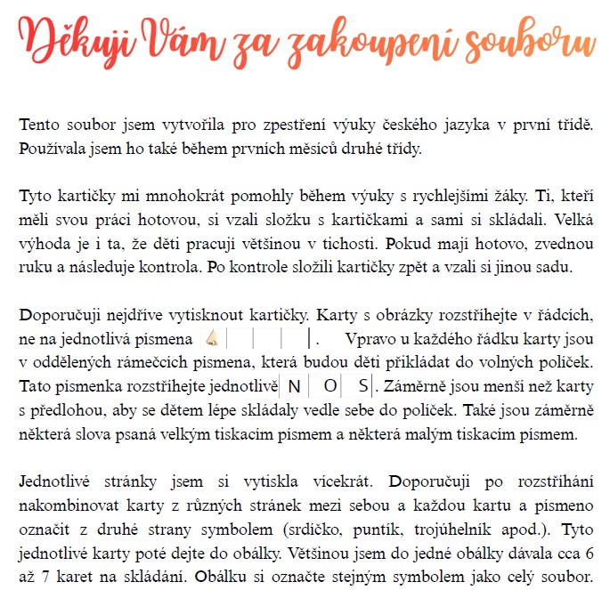 V souboru najdete 93 karet na deseti stranách s kartičkami písmen a metodická doporučení. Každá karta obsahuje obrázek a volná políčka pro chybějící písmena. Jednotlivé stránky jsou řazeny dle náročnosti