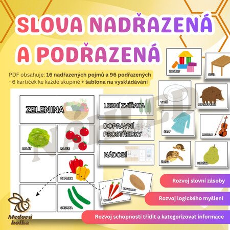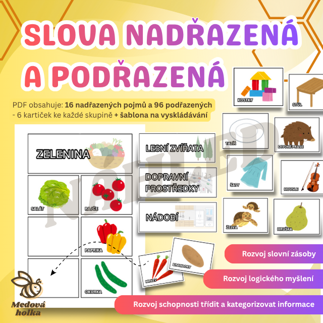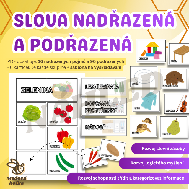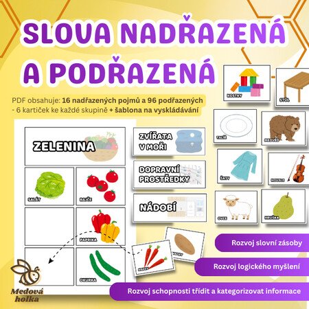 Tento materiál obsahuje sadu obrázků k procvičování slov nadřazených a podřazených. Pomocí vizuálního zpracování děti snadno pochopí, jak slova mezi sebou souvisejí - že některá označují širší skupinu věcí (např. nábytek), a jiná konkrétní příklady z této skupiny (např. židle, stůl či postel).