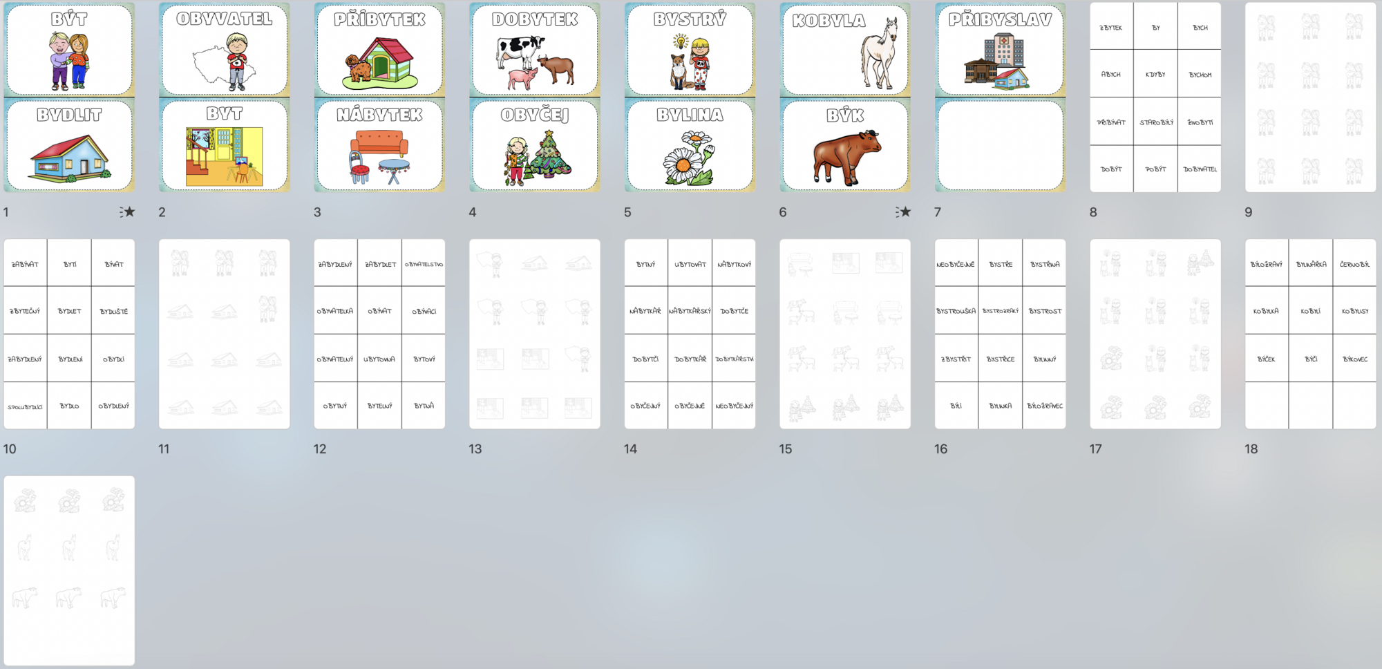 - Malé kartičky lze využít na spoustu jiných aktivit. Například přepis a vyznačení stavby slova (předpona, přípona, kořen). Velké podkladové karty lze využívat na srovnávání vyjm. slov, pantomimu, popis…