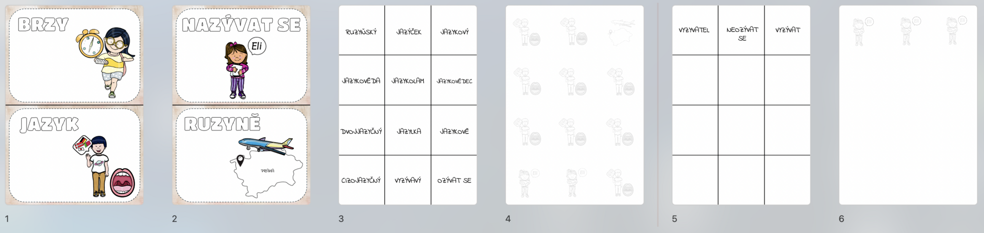 - Malé kartičky lze využít na spoustu jiných aktivit. Například přepis a vyznačení stavby slova (předpona, přípona, kořen). Velké podkladové karty lze využívat na srovnávání vyjm. slov, pantomimu, popis…