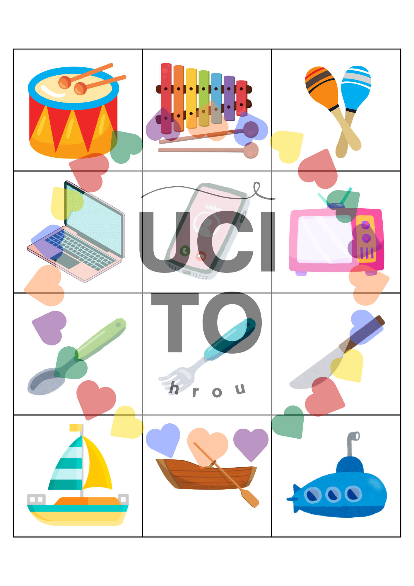 (nářadí, nábytek, hračky, příbor, nádobí, oblečení, boty, pokrývky hlavy, trička, zvířata, ryby, hmyz, divoká zvířata, domácí zvířata, zvířata na farmě, ptáci, nápoje, zelenina, ovoce, pečivo, stromy, květiny, povolání, členové rodiny, sporty, potraviny, sladkosti, hygienické potřeby, budovy, obchody, služby, místnosti, počasí, hudební nástroje, elektronika, dopravní prostředky, lodní doprava, letecká doprava, pozemní doprava, spotřebiče)