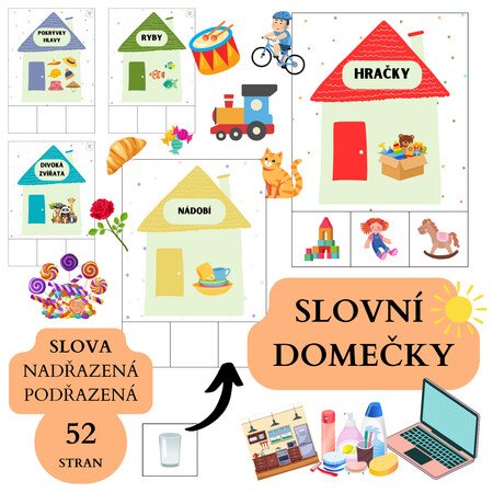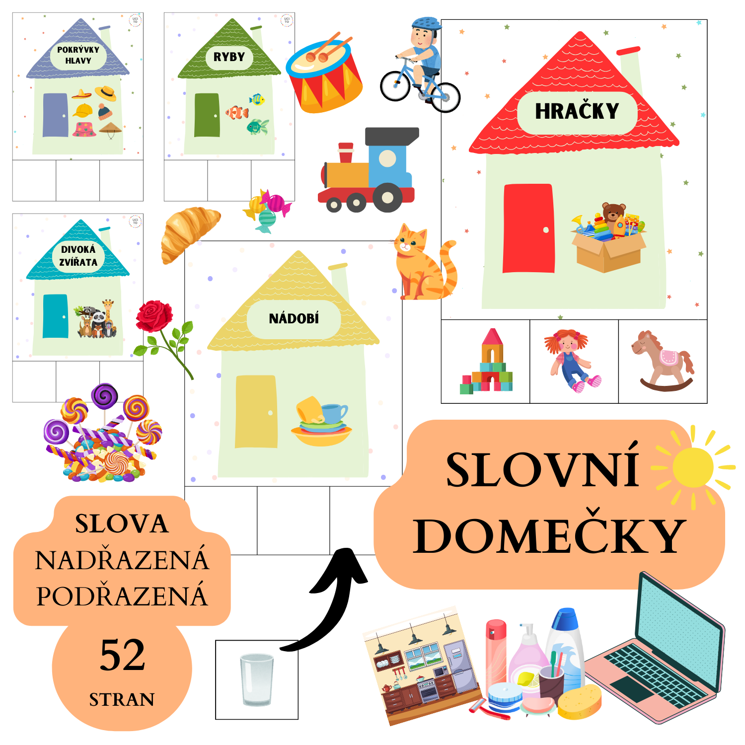 Uvnitř naleznete aktivitu zaměřenou na třídění obrázků podle slovních vztahů a to na slova obecná a konkrétní. Děti se učí hravou formou, rozvíjejí slovní zásobu a získávají povědomí o českém jazyce.