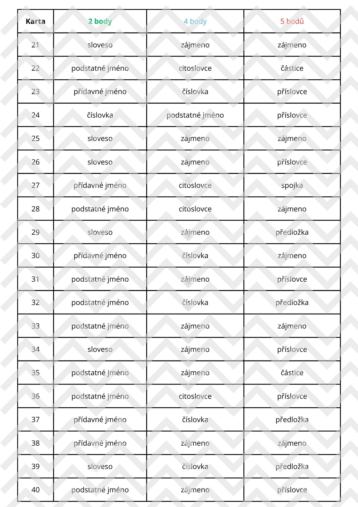 - Když soutěžící určí slovní druh špatně, možnost odpovědi dostává další tým. Pokud správně odpoví, získává 1 bod.