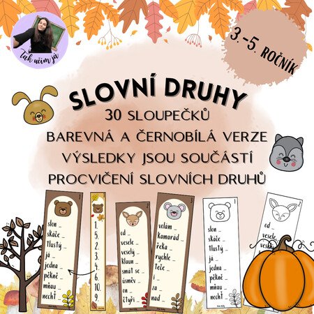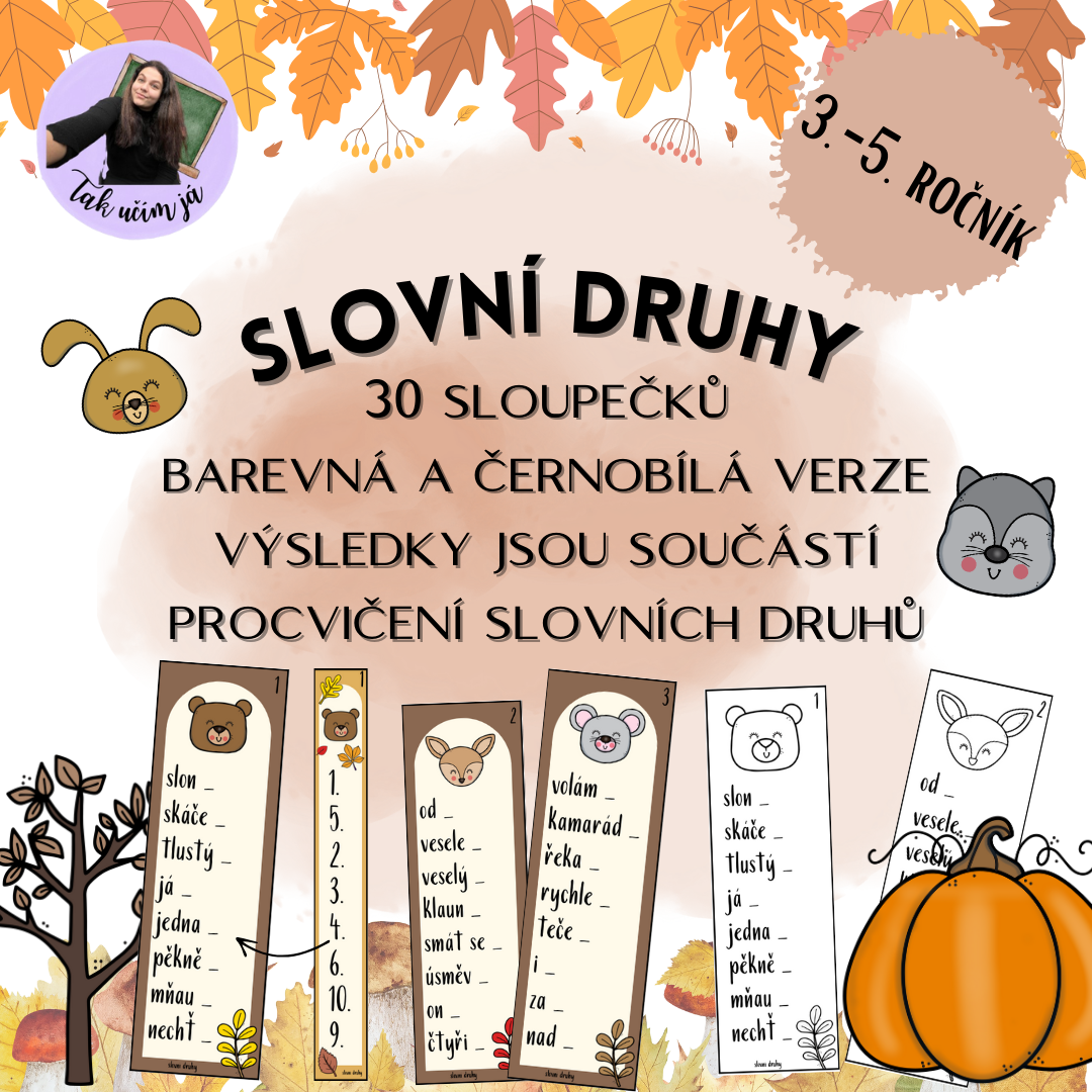 Materiál slovní druhy slouží k opakování slovních druhů. Kartičky jsou vhodné pro žáky 3.-5. ročníku. Využijete v rámci stanovišť, samostatné práce, jako práci pro rychlíky, diktování sloh nebo běhací diktát 🍂