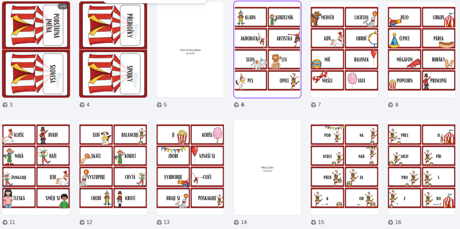 kartičky rozmístěné po třídě, postupně je nosí do správného cirkusu (podstatná jména k nápisu podstatná jména)