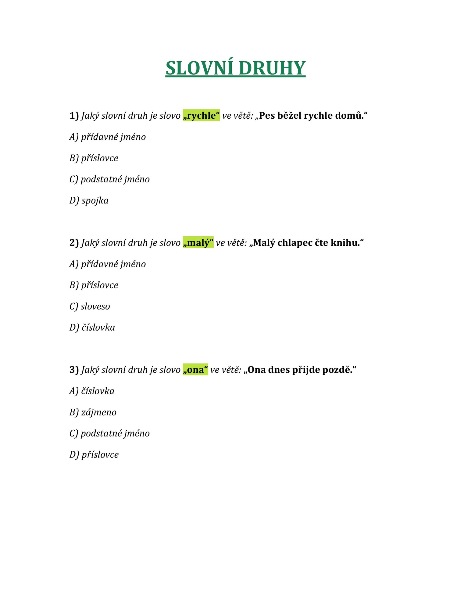 Materiál obsahuje 50 testových otázek na určení správného slovního druhu v dané konkrétní větě.