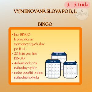 Materiál obsahuje 20 listů k vytištění s vyjmenovanými slovy po B a L včetně slov příbuzných 44 kartiček pro náhodný