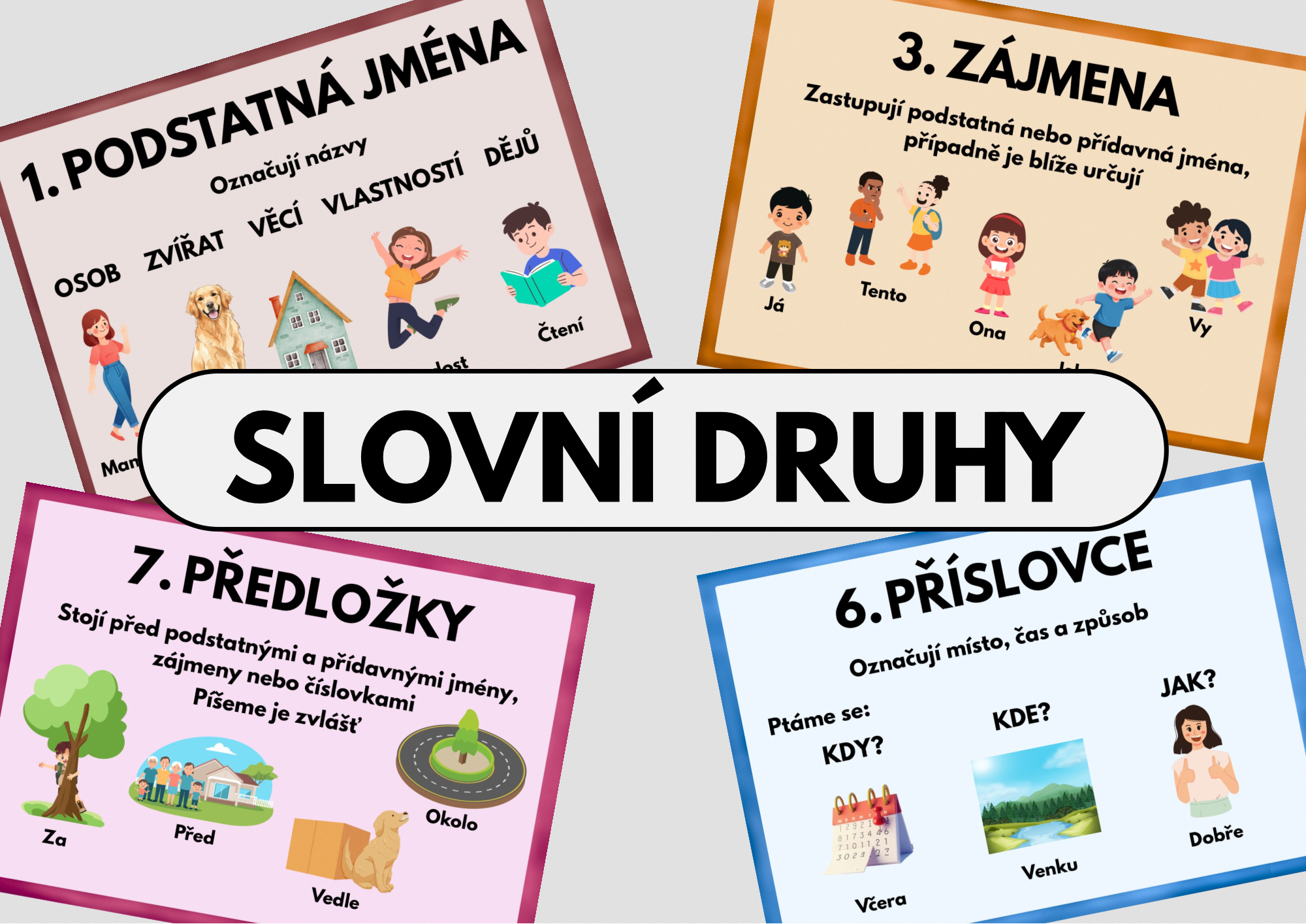 Plakáty se SLOVNÍMI DRUHY velikosti A3, které jsou vhodné k použití na výzdobu třídy na prvním stupni základní školy.