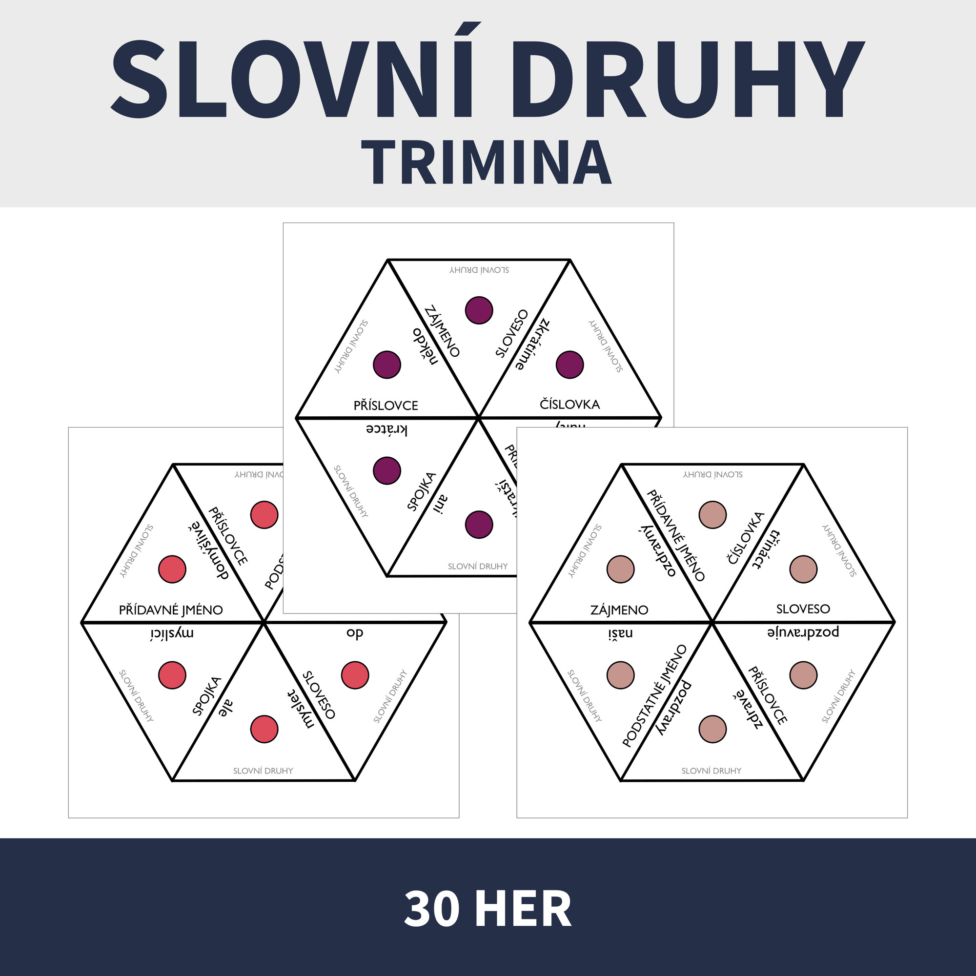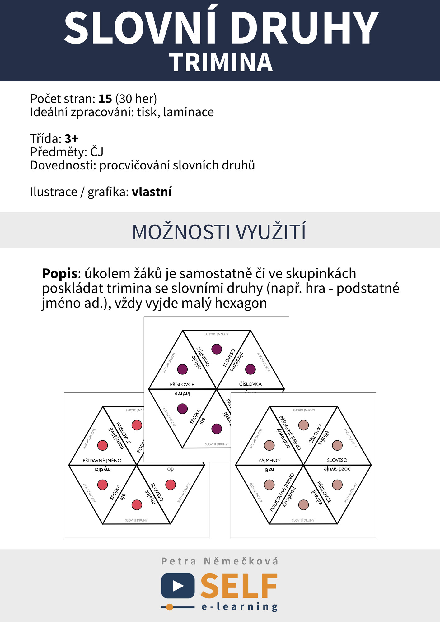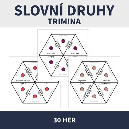 Popis: úkolem žáků je poskládat trimina se slovními druhy (k sobě patří např. hra - podstatné jméno ad.), vždy vyjde malý hexagon. Lze pojmout jako samostatnou či skupinovou práci.