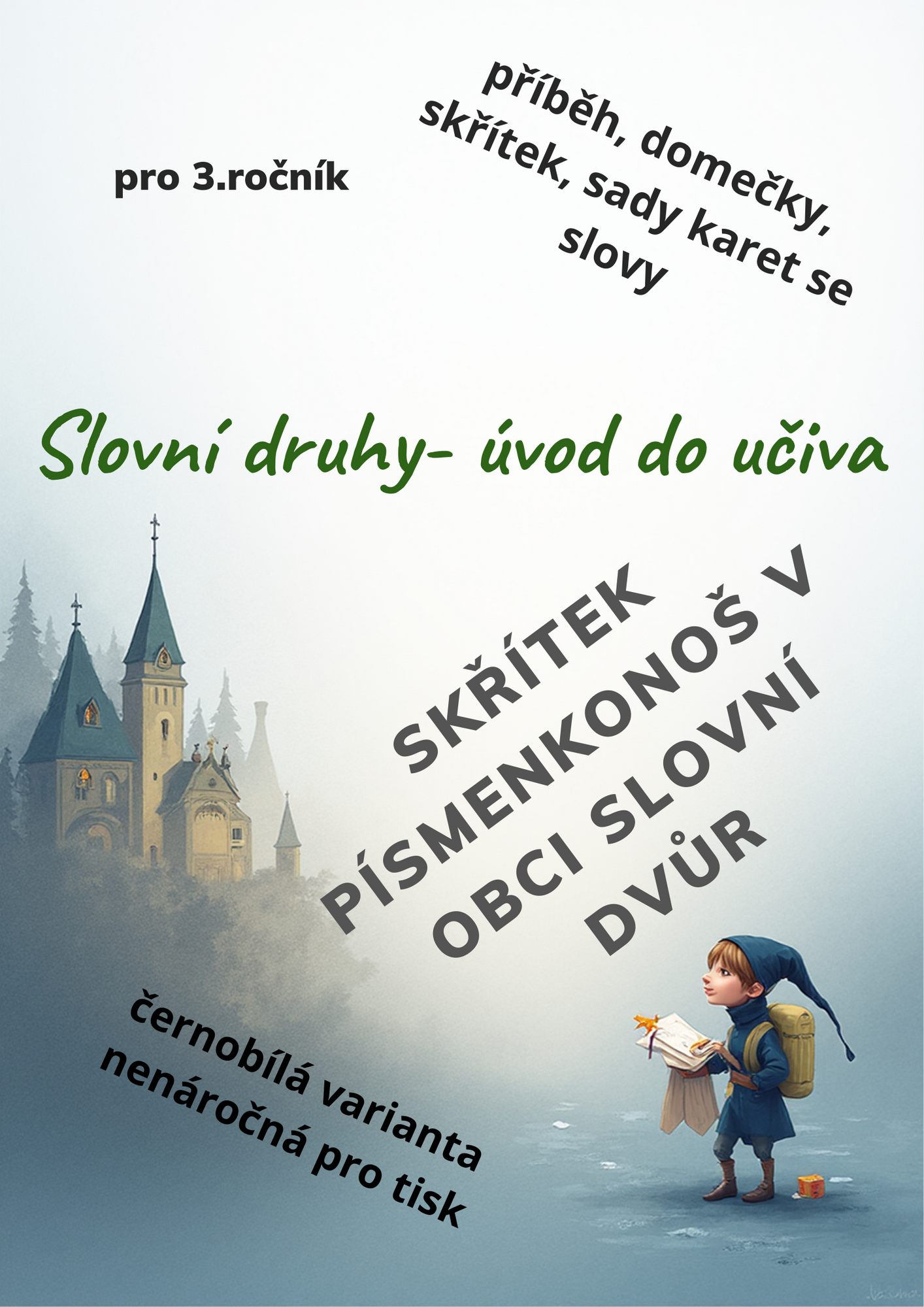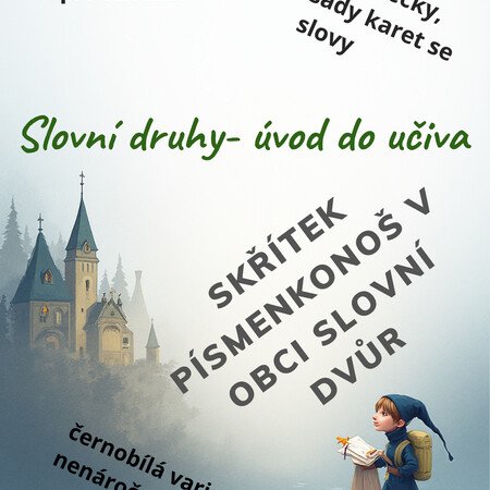 Materiál, který obsahuje kompletní sestavu pro úvod do učiva o slovních druzích ve2.- 3. ročníku. Jedná se o 20 listů, které obsahují motivační úvod s příběhem na přečtení, obrázky domečků s popisy slovních druhů a jejich charakteristiku, obrázek skřítka Písmenkonoše a sadu 10 stran se slovy zastupujícími různé slovní druhy, jsou na kartičkách v podobě dopisu se známkou. Dětem je přečten příběh se zápletkou, kterou pomáhají skřítkovi vyřešit. Vše je v černobílé variantě, domečky jsou řešeny jednoduchým způsobem, lze je s žáky před laminací vybarvit. K aktivitě si můžete z krabiček vytvořit poštovní schránky, ale aktivitu lze provést i bez.