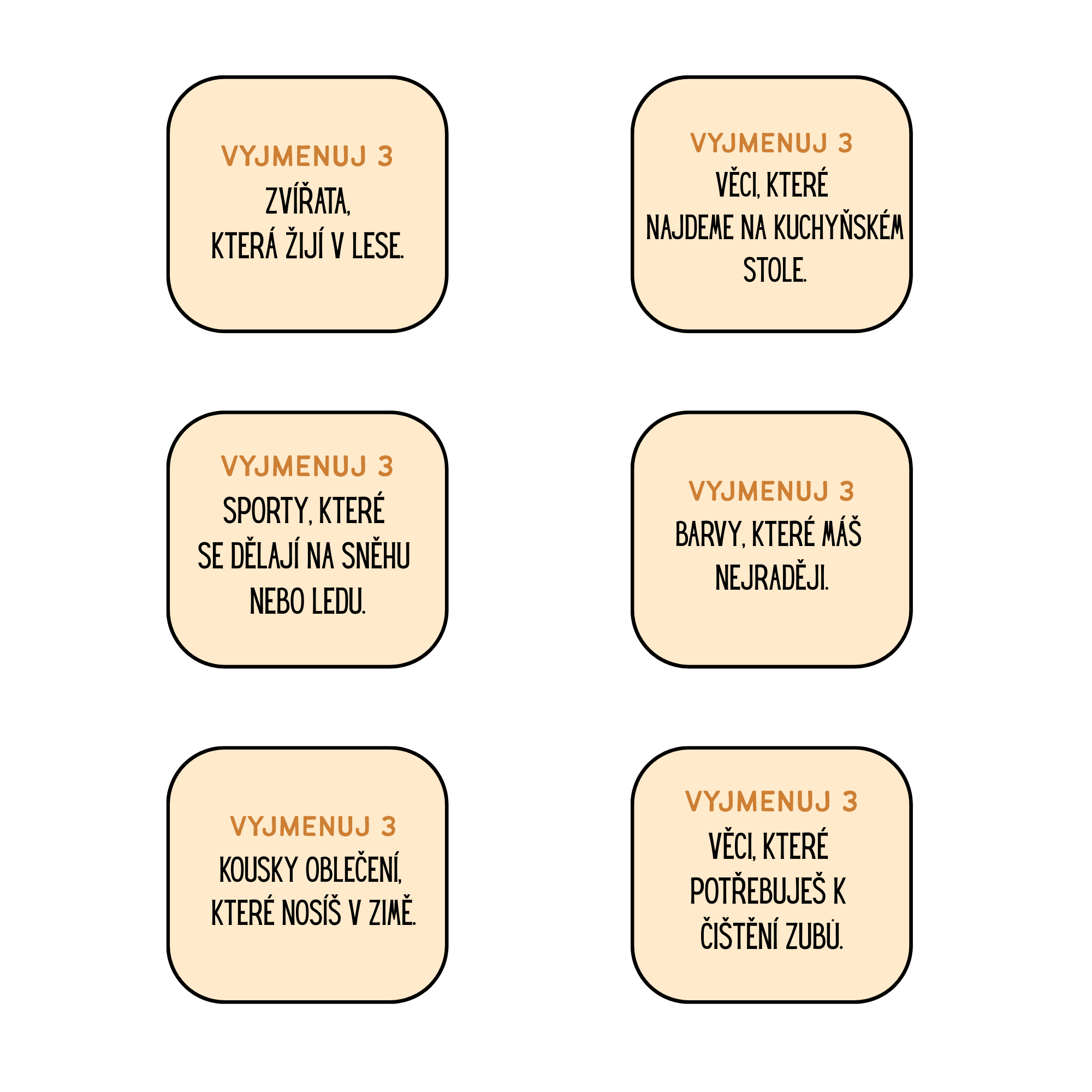 Vyjmenuj X je svižná karetní hra, kde hrají roli pohotovost a bystrá mysl. Cíl je jednoduchý: buďte první, kdo vyjmenuje 3, 4 nebo 5 věcí z dané kategorie, a získejte kartu!