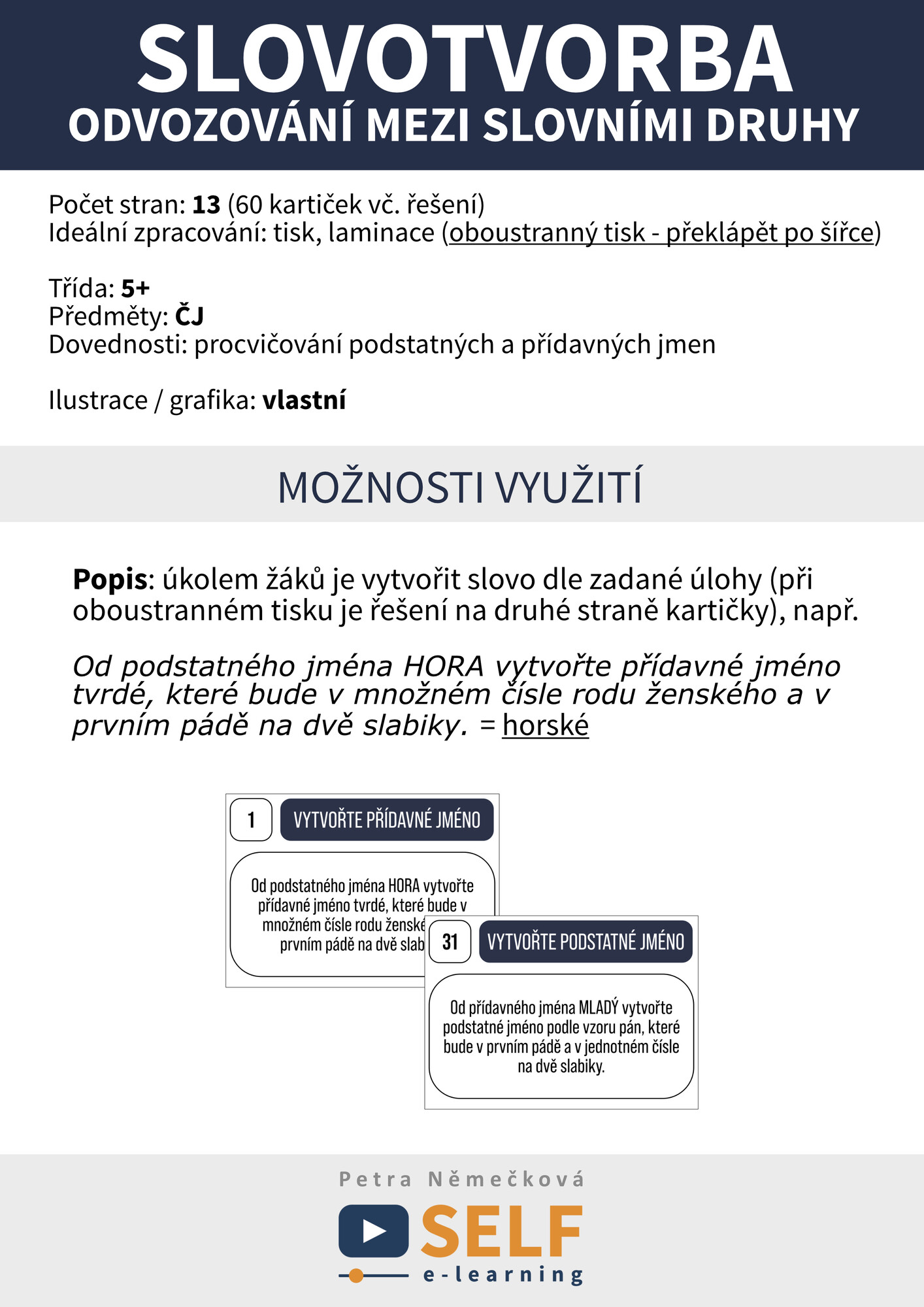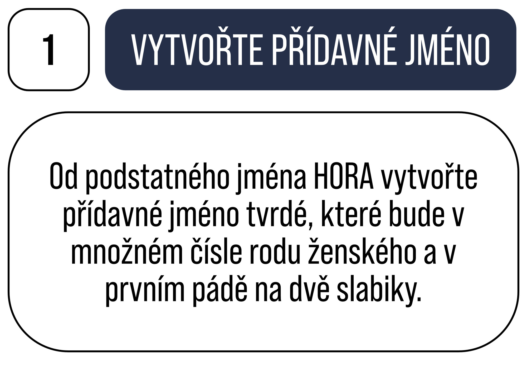 Popis: úkolem žáků je vytvořit slovo dle zadané úlohy (při oboustranném tisku je řešení na druhé straně kartičky), např. Od podstatného jména HORA vytvořte přídavné jméno tvrdé, které bude v množném čísle rodu ženského a v prvním pádě na dvě slabiky. = horské