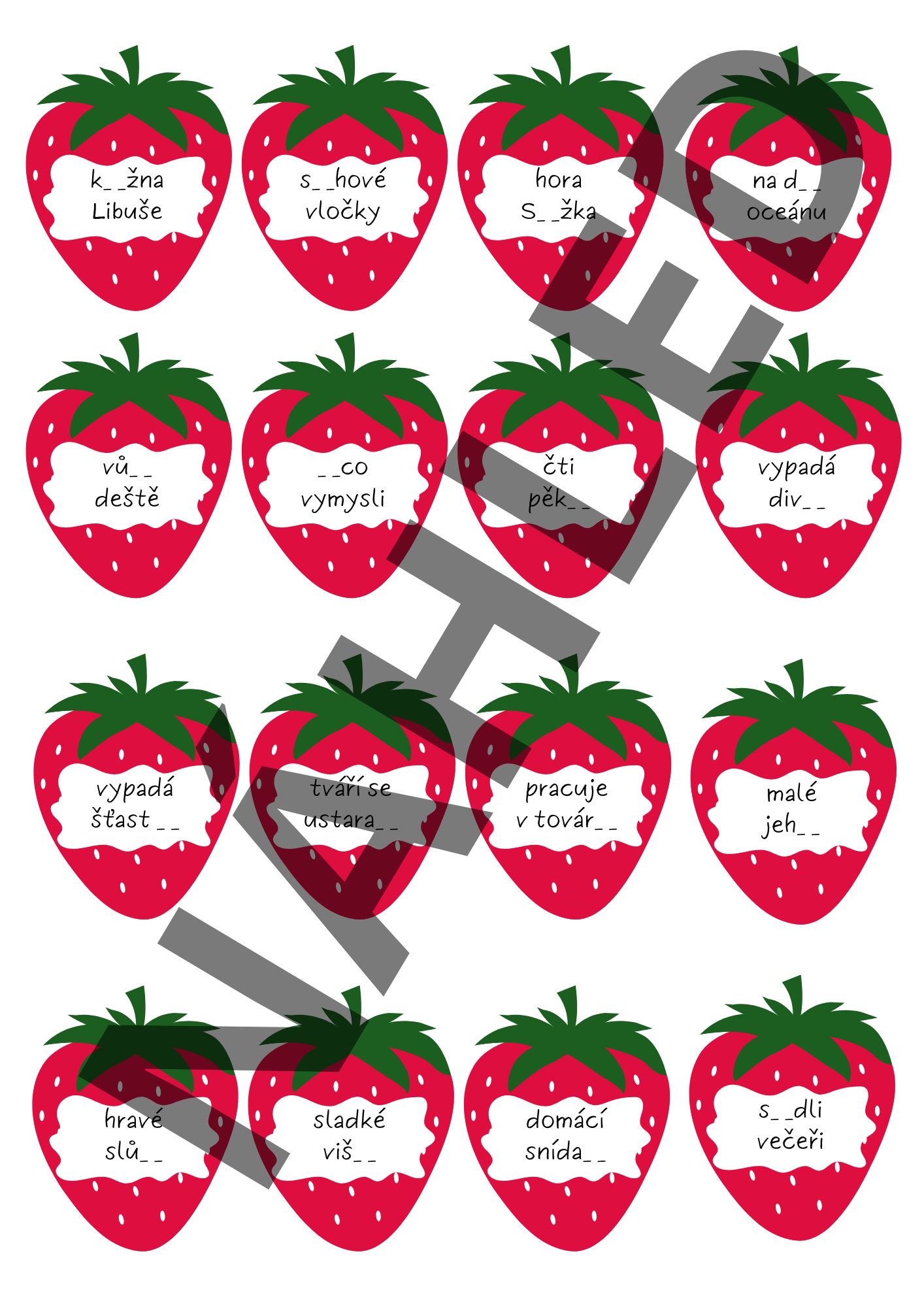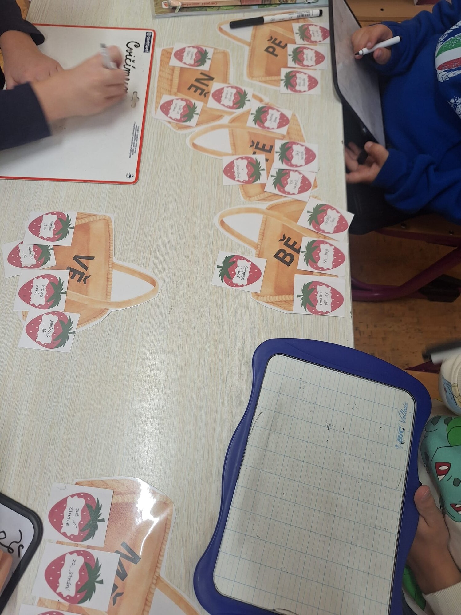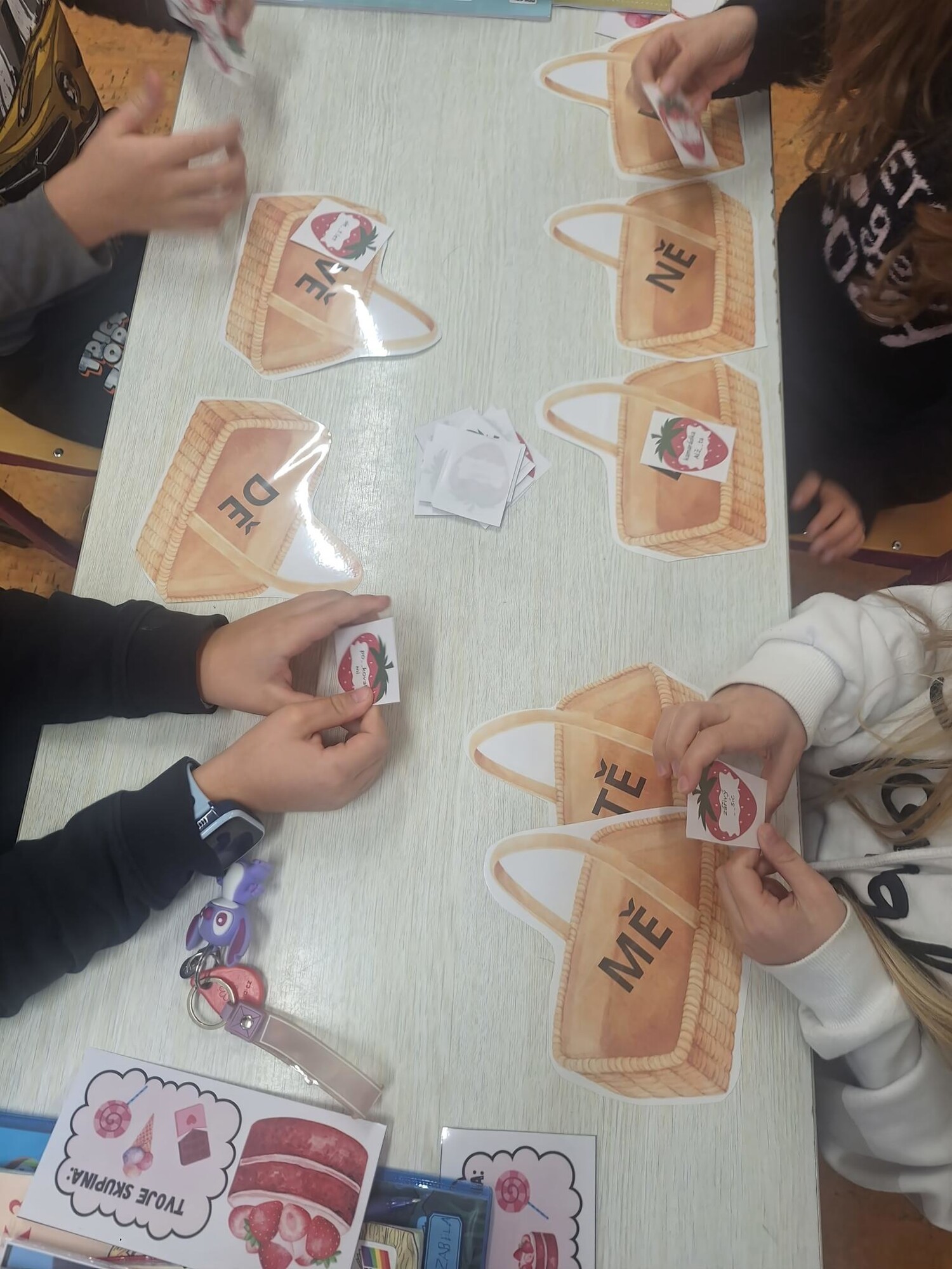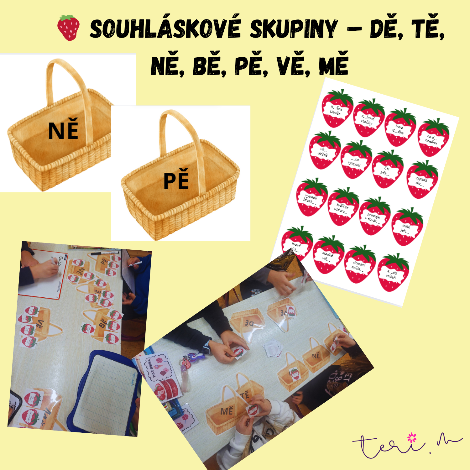 Úkolem dětí je přiřadit jahůdky ke správným košíčkům (celkem 7), podle dané souhláskové skupiny
