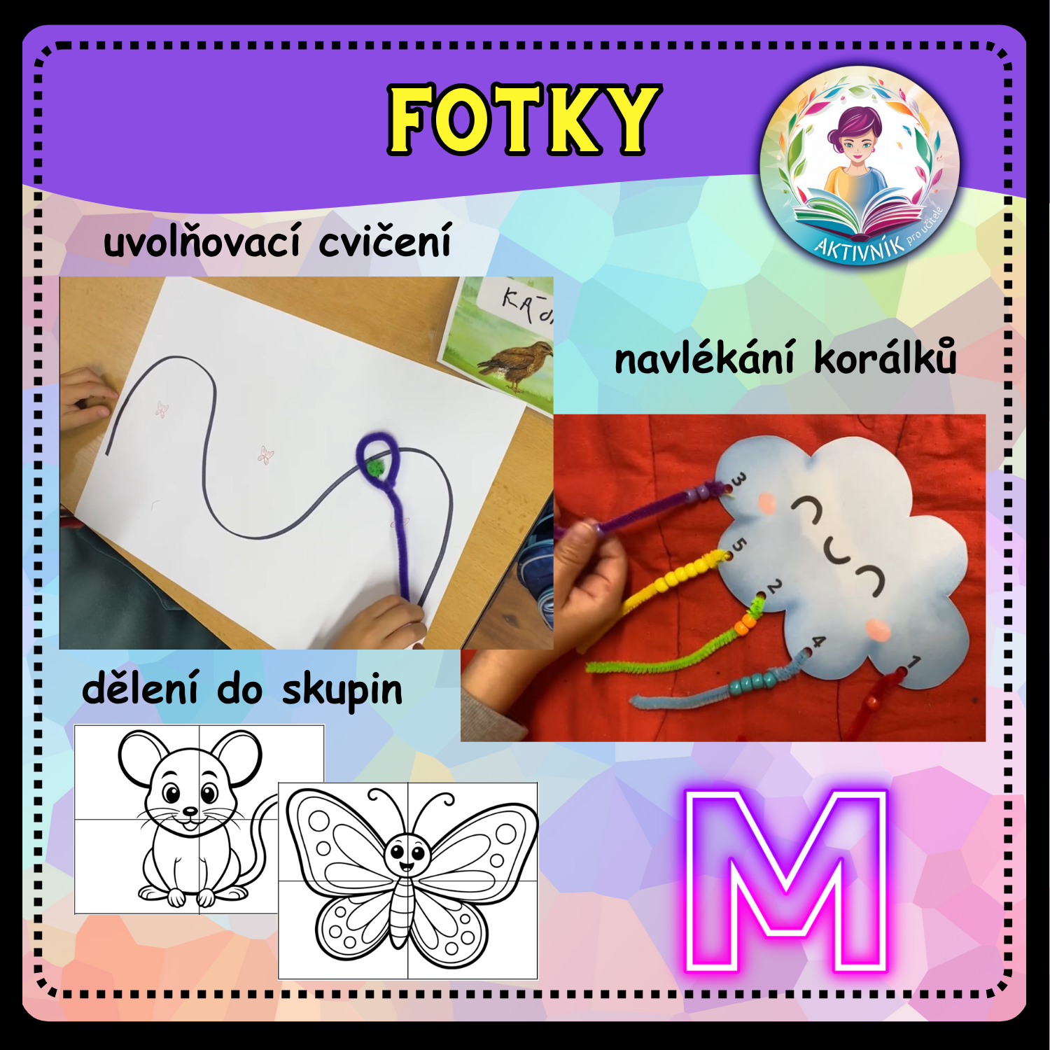 Materiál rozvíjí grafomotorické dovednosti, spolupráci a hravou formou upevňuje znalost písmena M.