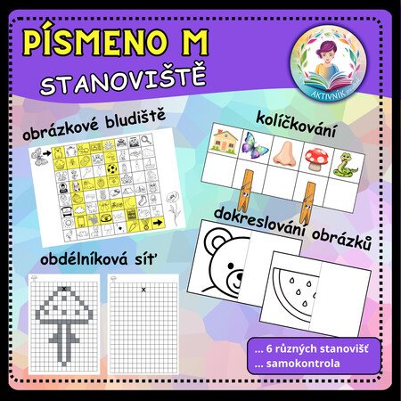 „Stanoviště na písmeno M“ je hravý a variabilní materiál, který pomáhá dětem procvičit nové písmeno zábavnou formou. Obsahuje 6 různých stanovišť s úkoly zaměřenými na rozpoznání a upevnění hlásky M:
