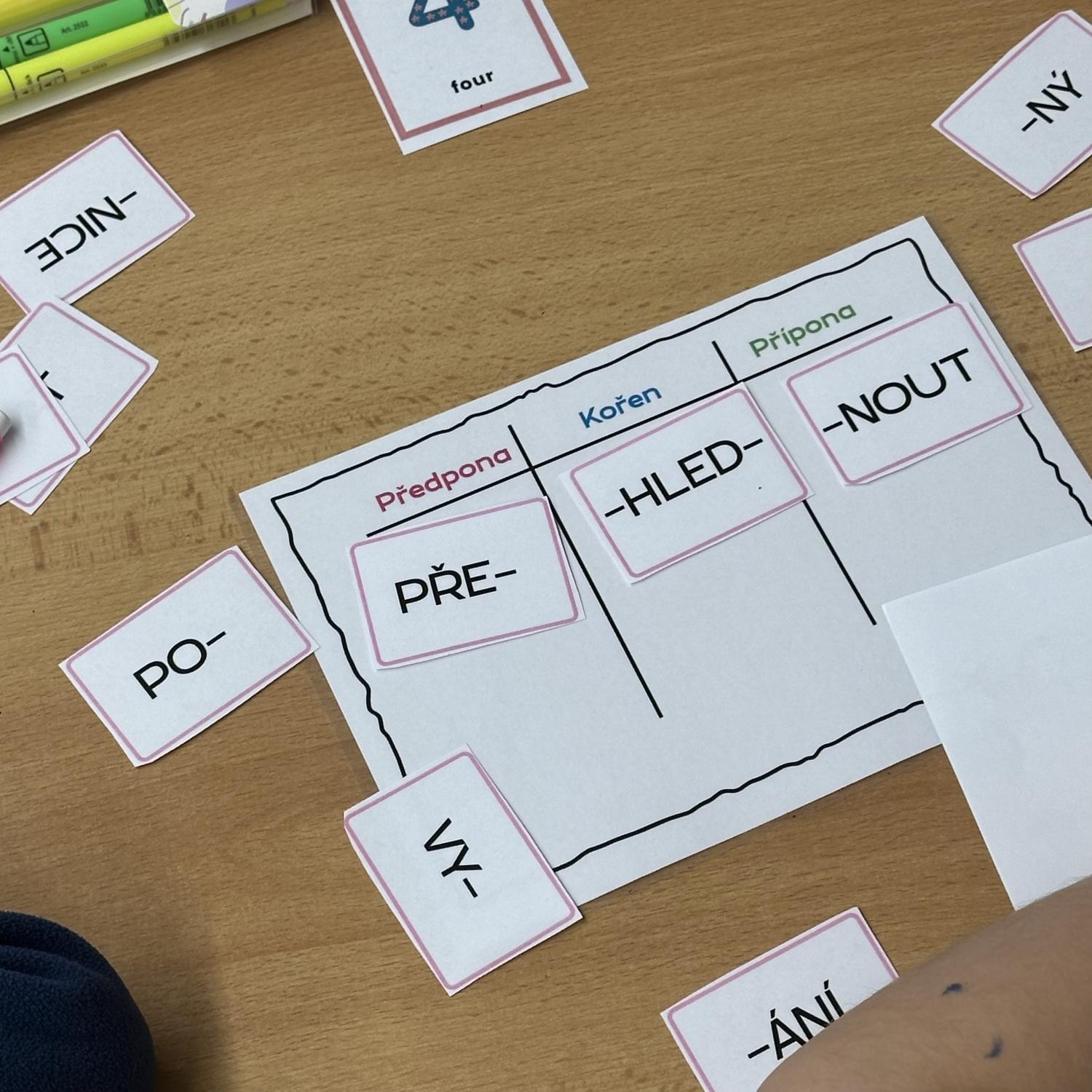 Žáci skládají slova z nabízených částí – předpon, kořenů a přípon.