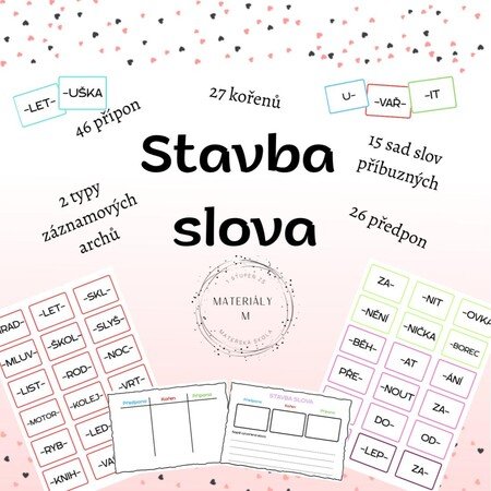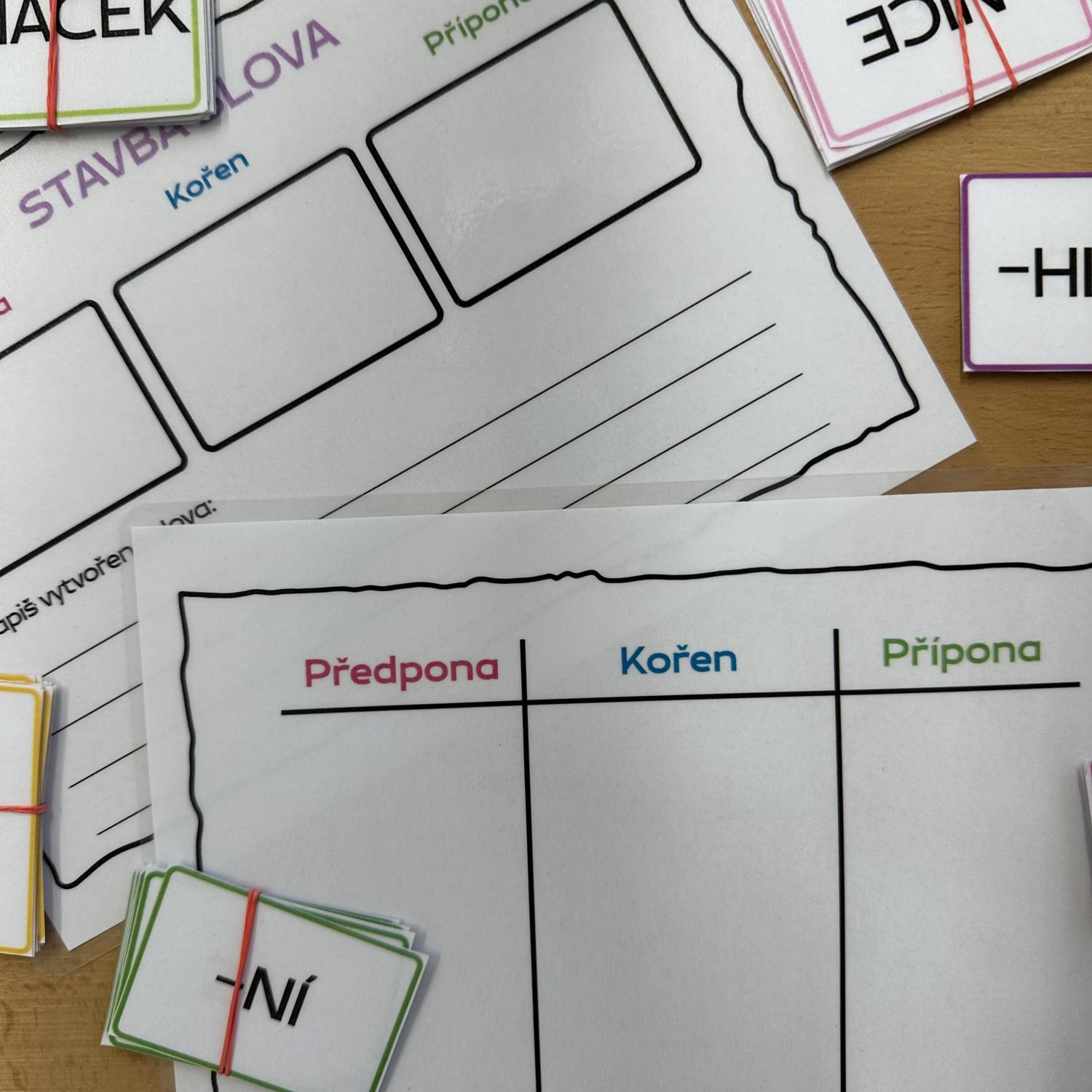 Součástí materiálu jsou záznamové karty ve dvou verzích – jedna pro přehledné rozdělení předpony, kořene a přípony, druhá linkovaná pro psaní fixem po zalaminování.