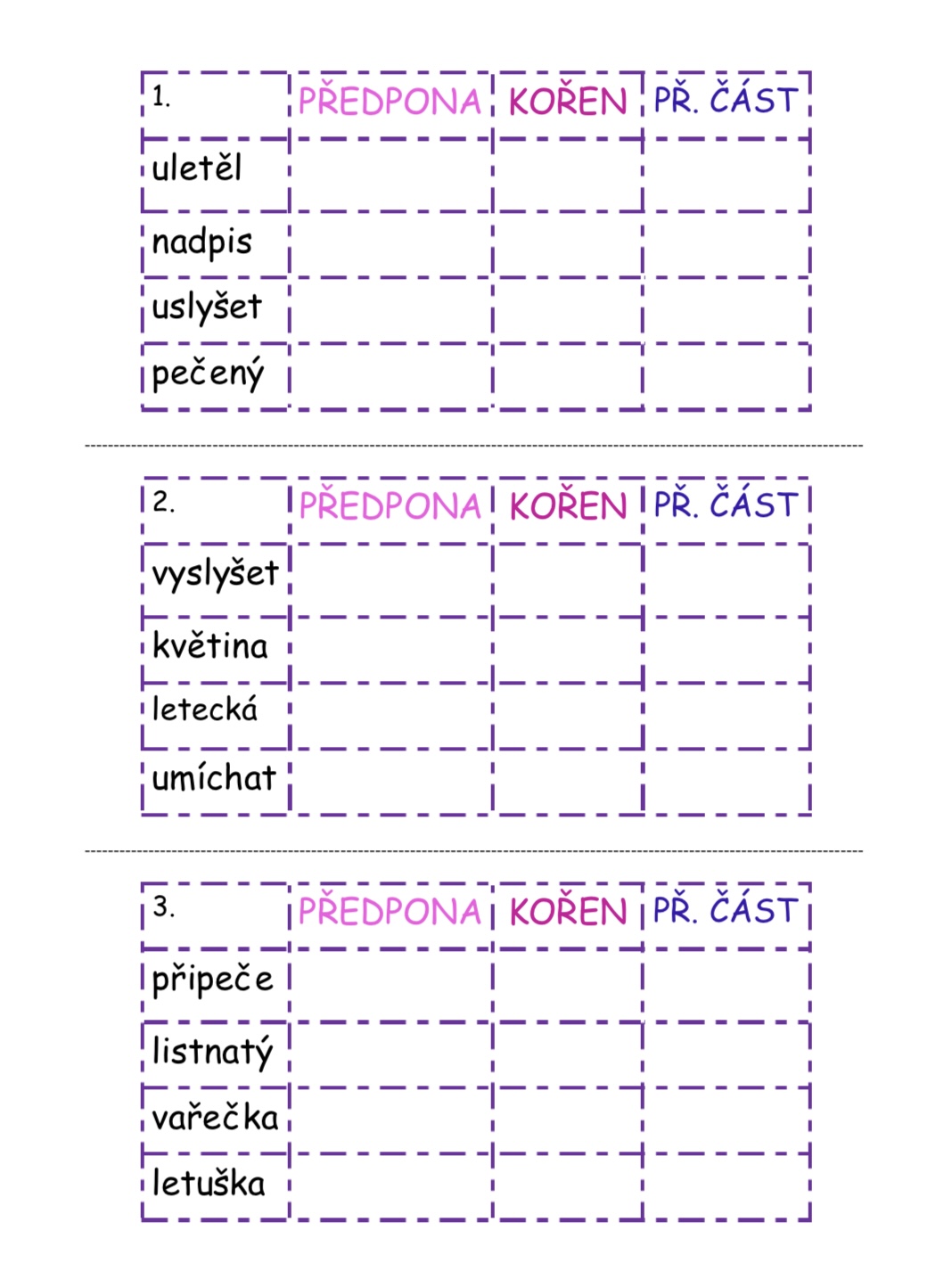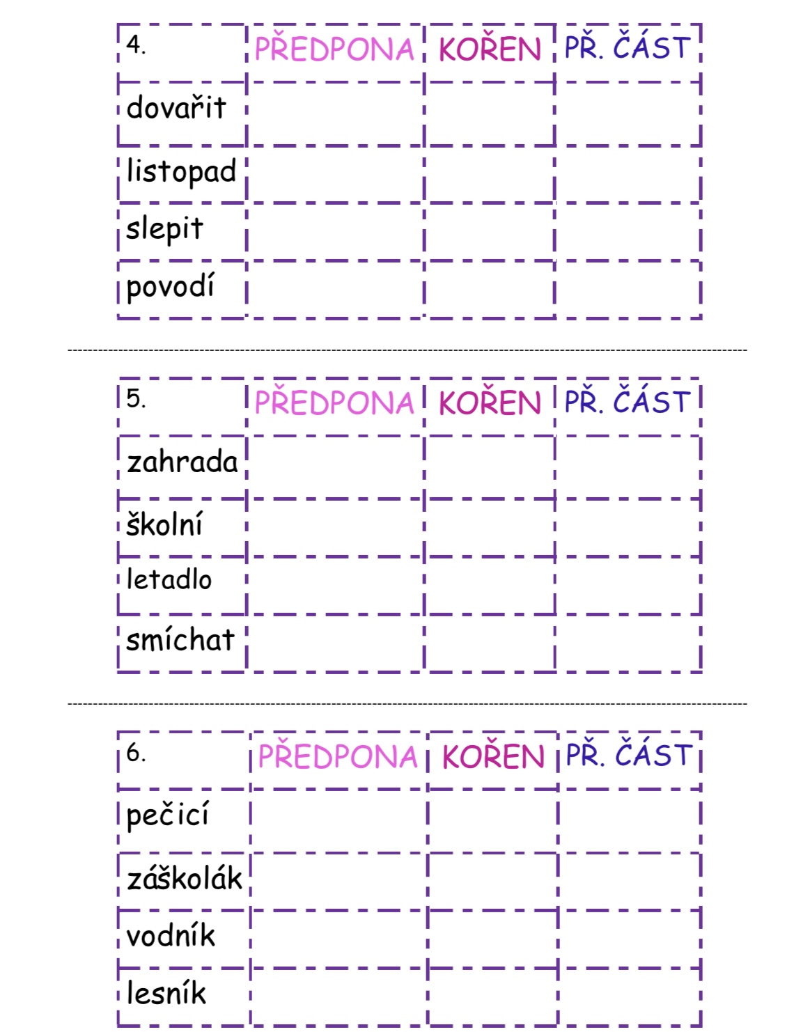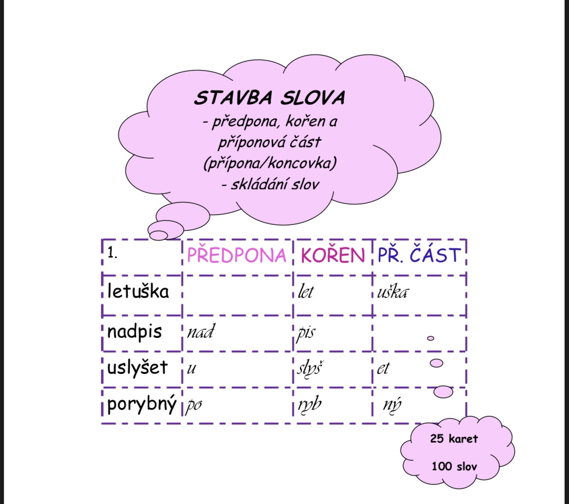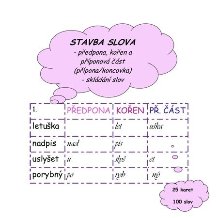 Materiál obsahuje 25 karet po čtyřech slovech (celkem 100 slov), v nichž si žáci procvičí stavbu slova – rozdělení na předponu, kořen a příponovou část.
