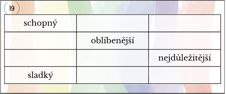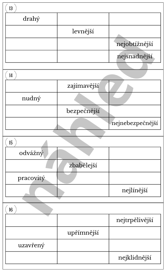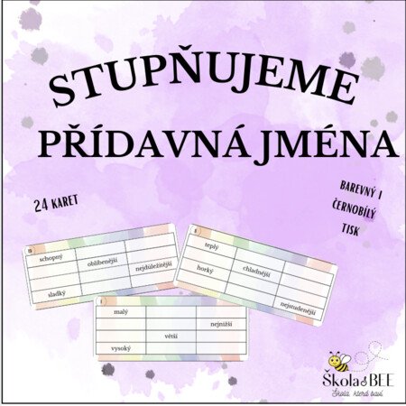 Soubor obsahuje 24 karet zaměřených na stupňování přídavných jmen (1., 2. a 3. stupeň) pro 5. ročník ZŠ. Materiál lze využít jako pracovní list nebo po rozstříhání jako kartičky. Po zalaminování je možné psát mazacím fixem a používat opakovaně.