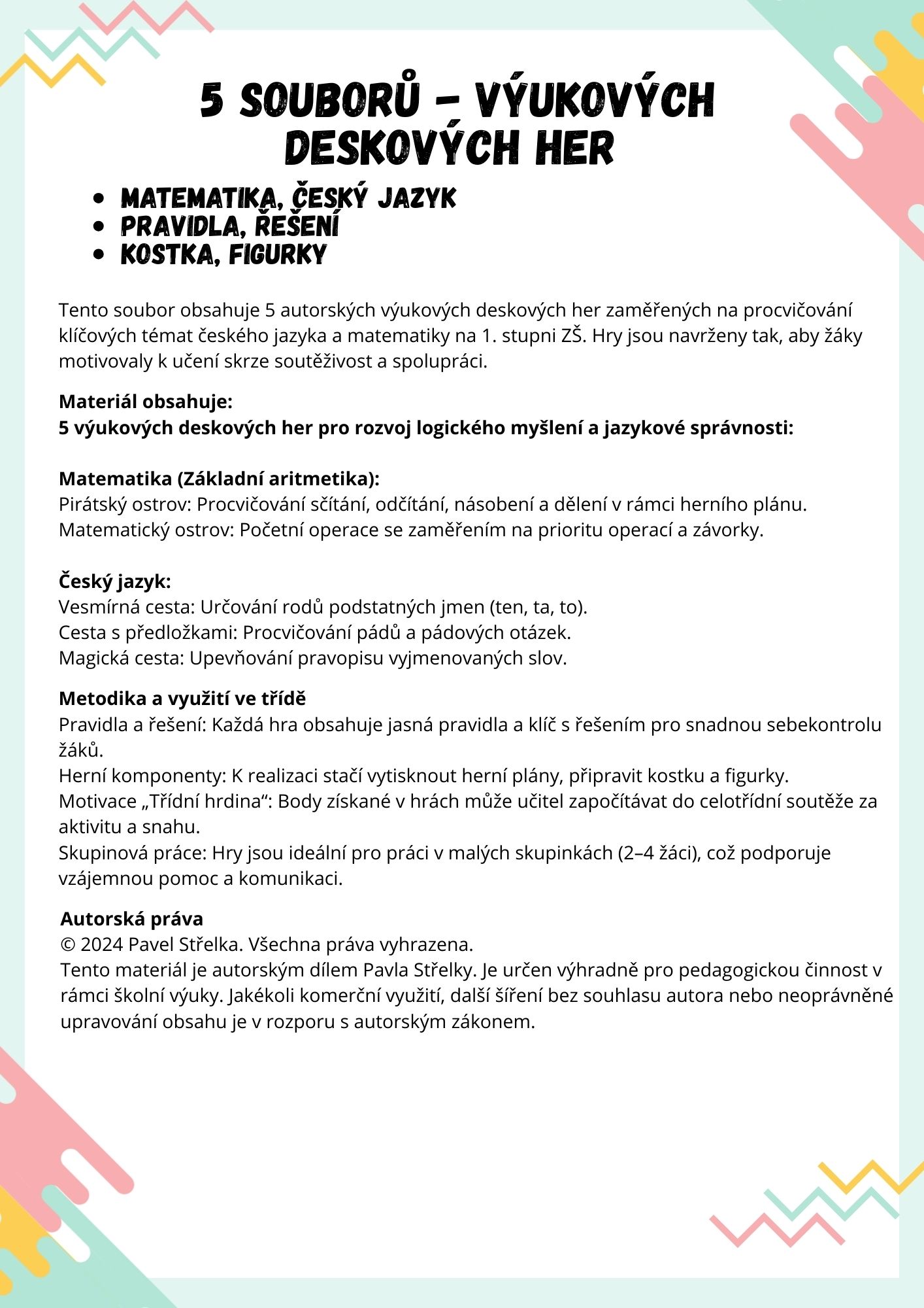 Pravidla a řešení: Každá hra obsahuje jasná pravidla a klíč s řešením pro snadnou sebekontrolu žáků. Herní komponenty: K realizaci stačí vytisknout herní plány, připravit kostku a figurky. Motivace „Třídní hrdina“: Body získané v hrách může učitel započítávat do celotřídní soutěže za aktivitu a snahu. Skupinová práce: Hry jsou ideální pro práci v malých skupinkách (2–4 žáci), což podporuje vzájemnou pomoc a komunikaci.