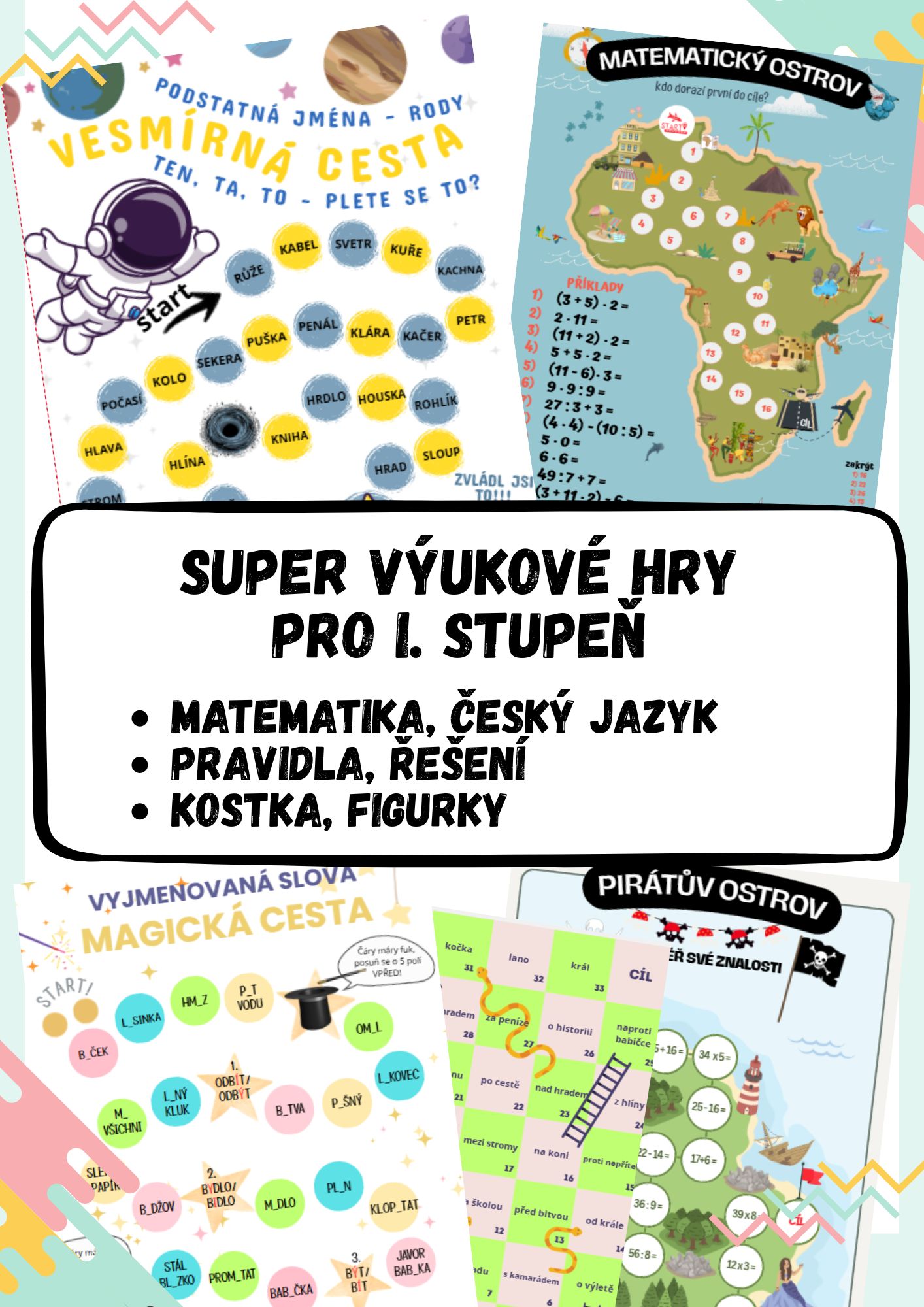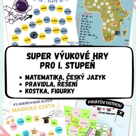 Tento soubor obsahuje 5 autorských výukových deskových her zaměřených na procvičování klíčových témat českého jazyka a matematiky na 1. stupni ZŠ. Hry jsou navrženy tak, aby žáky motivovaly k učení skrze soutěživost a spolupráci.