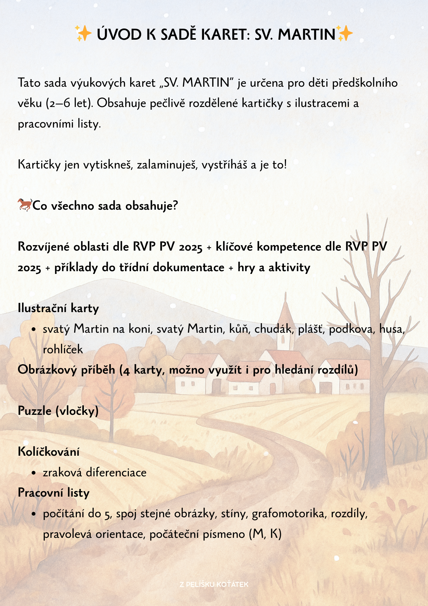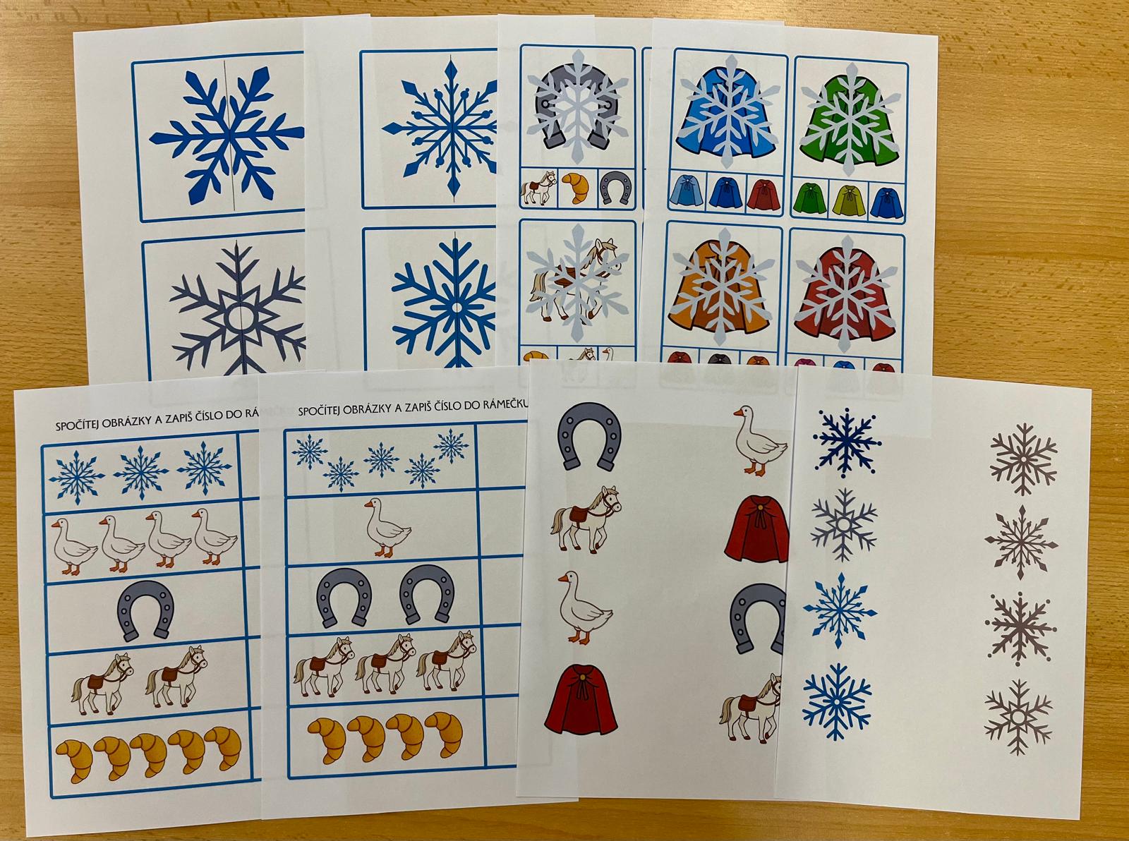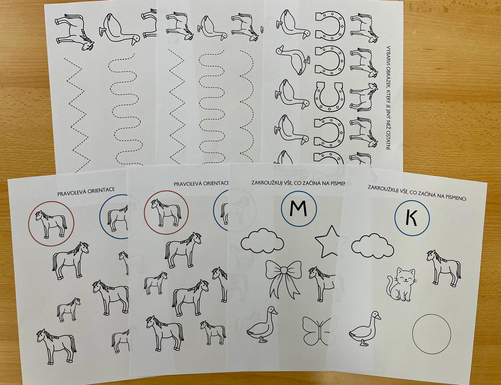 - počítání do 5, spoj stejné obrázky, stíny, grafomotorika, rozdíly, pravolevá orientace, počáteční písmeno (M, K)