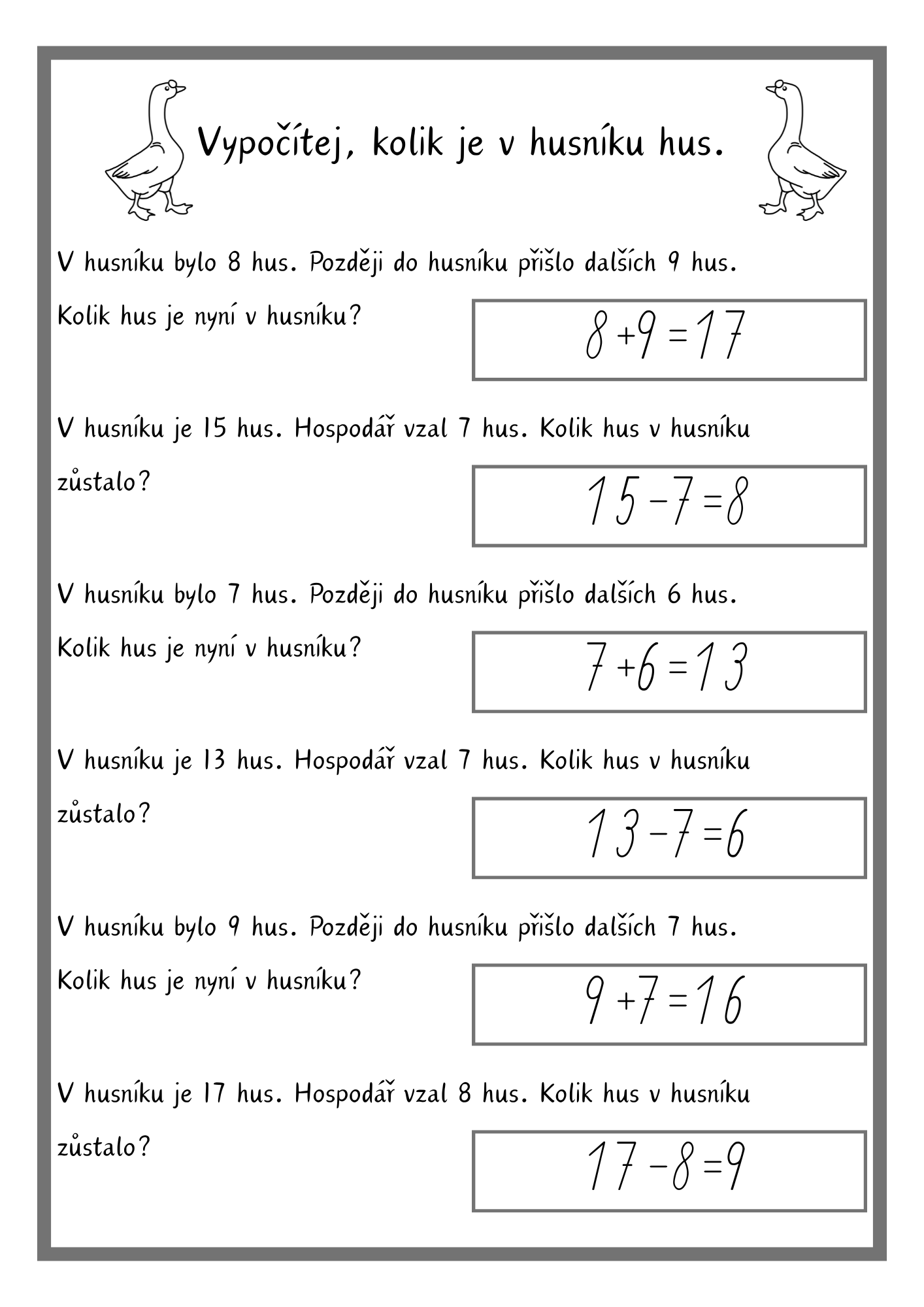 - matematické úlohy s husami – sčítání a odčítání včetně přechodu přes desítku