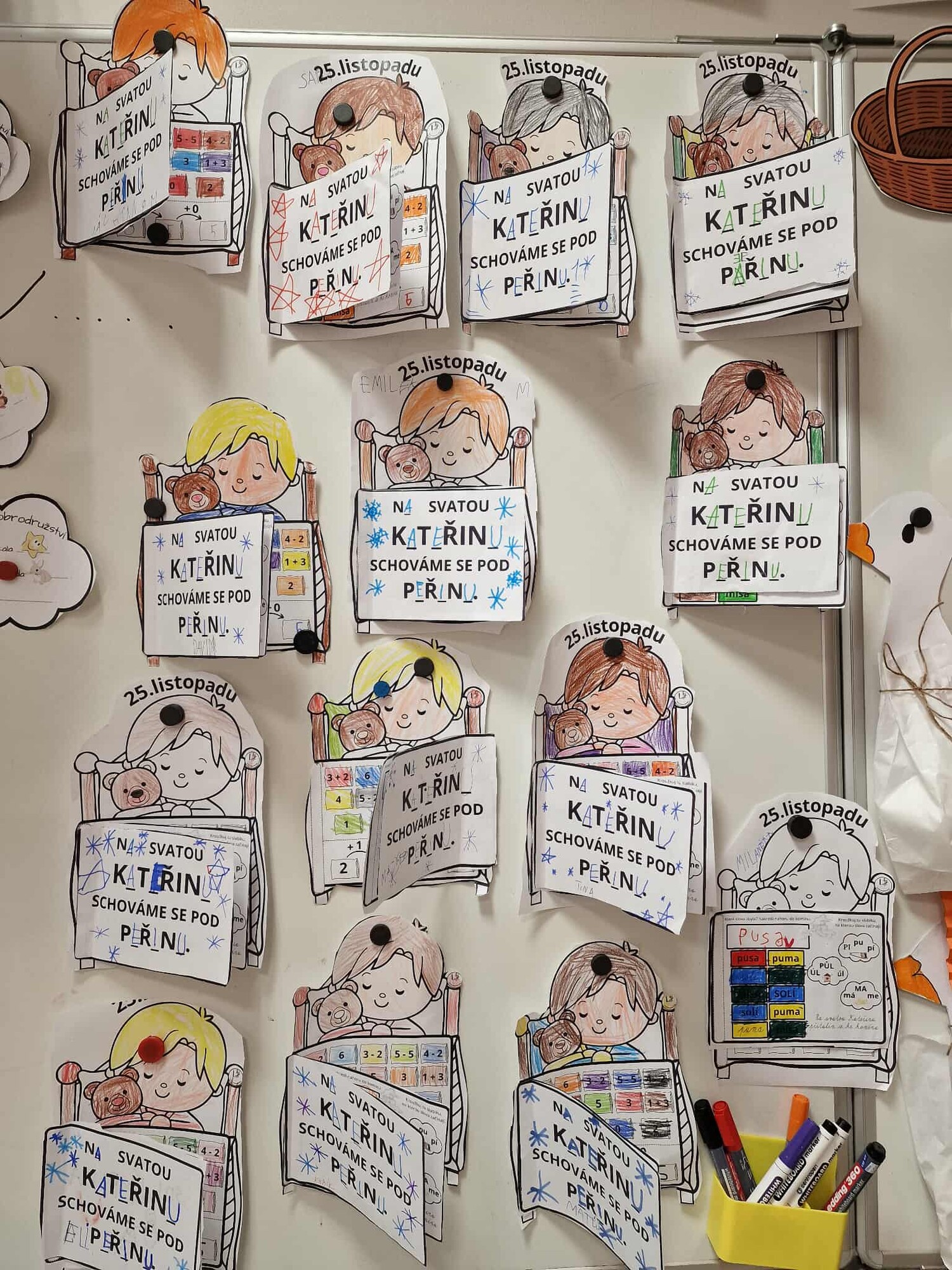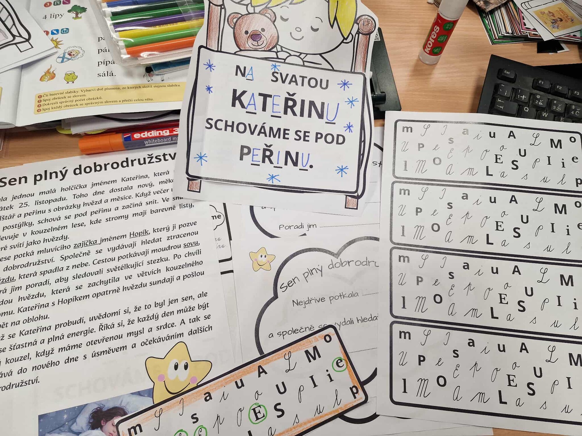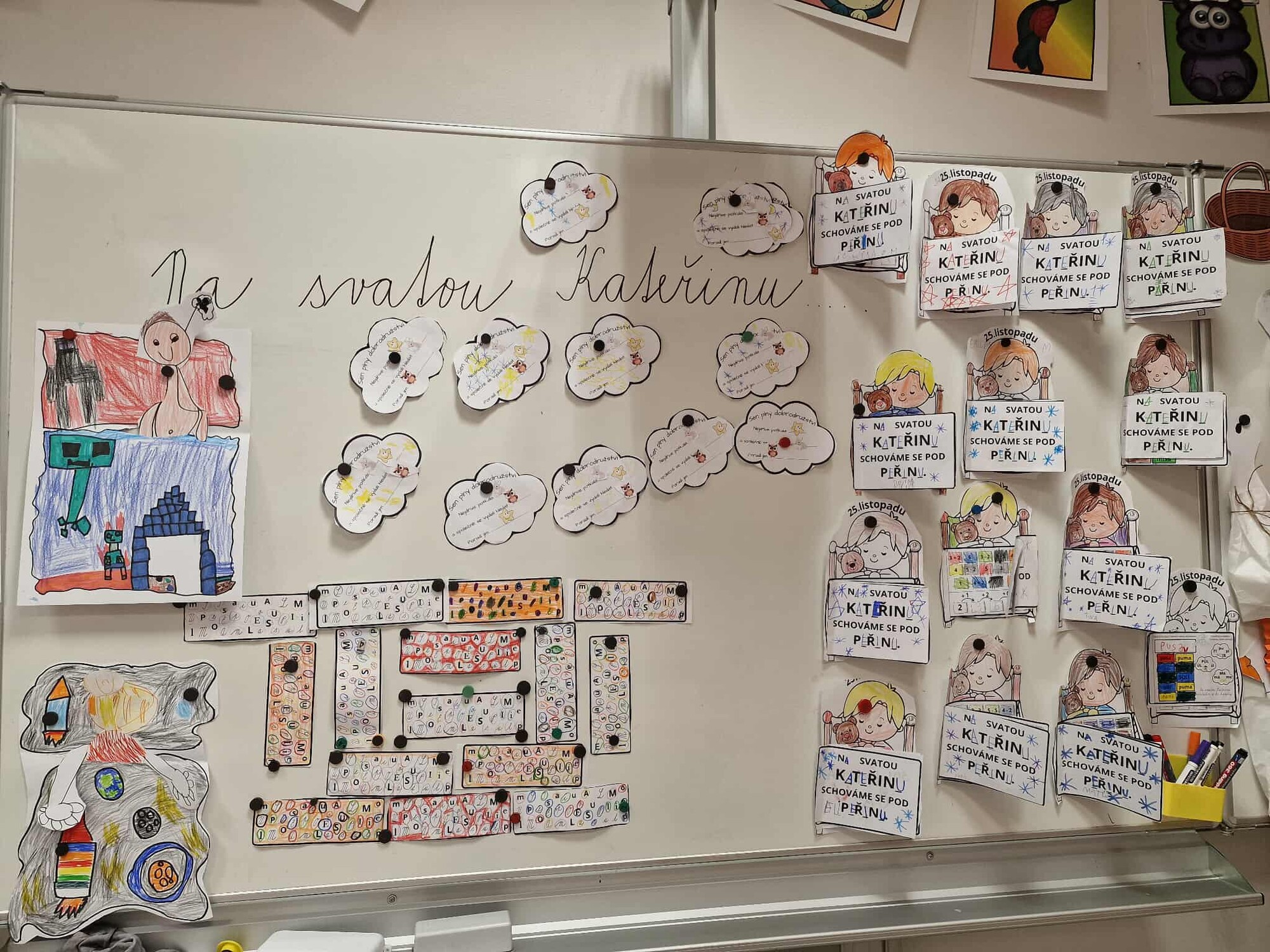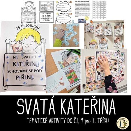 Pojďme si opakovat ČJ a M tematicky se svatou KATEŘINOU a vytvořme pěknou výzdobu. Materiál obsahuje dítě v posteli a 2 části peřiny, které lepíme na dané místo - otáčíme jako knížečku. První je pranostika s vynechanými písmeny. V dalším najdeme další pranostiku o komínu, proto děti vykreslují v komíně stejně znějící slova, 1 slovo nemá trojici, toto slovo nakreslí nebo napíší na horní část komínu. V každém obláčku označí slabiku, na kterou začíná daný obrázek. Ve třetí části máme matematiku - děti vykreslují příklad a výsledek stejnou barvou a dole vypočítají řetězec. Součásti materiálu jsou dále cihle, ve kterých děti označují stejná písmena stejnou barvou, každý svoji cihlu vystřihne a společně tvoří komín. Vytvoří, že se z komínu kouří pomocí obláčku, kde najdeme úkoly k přiložené povídce.