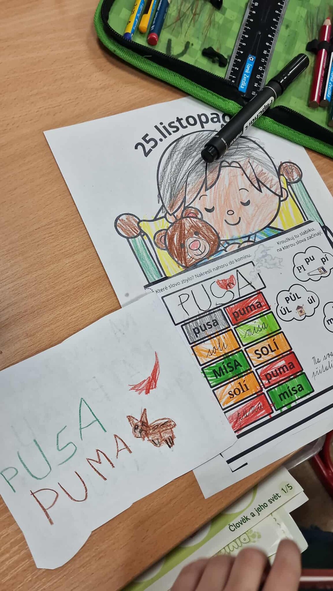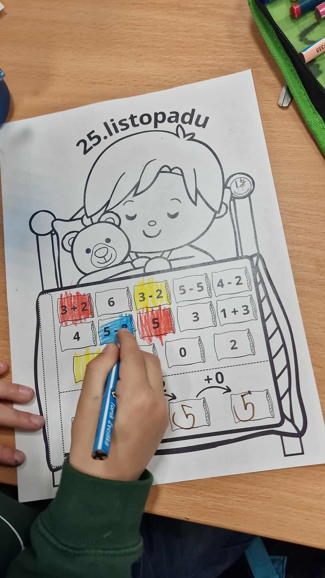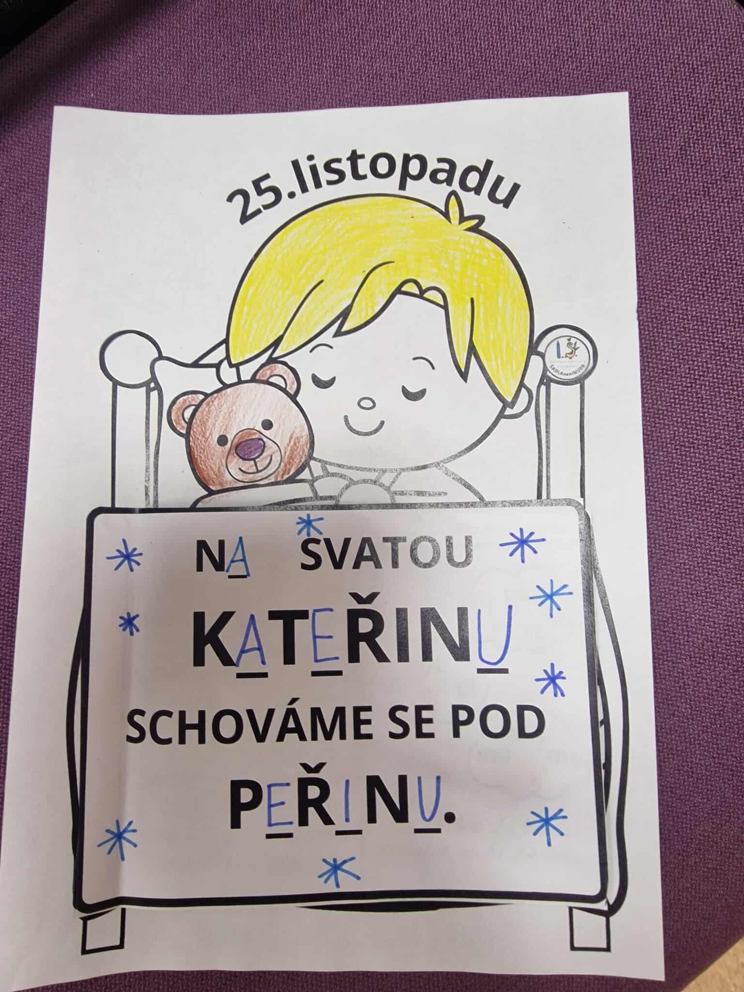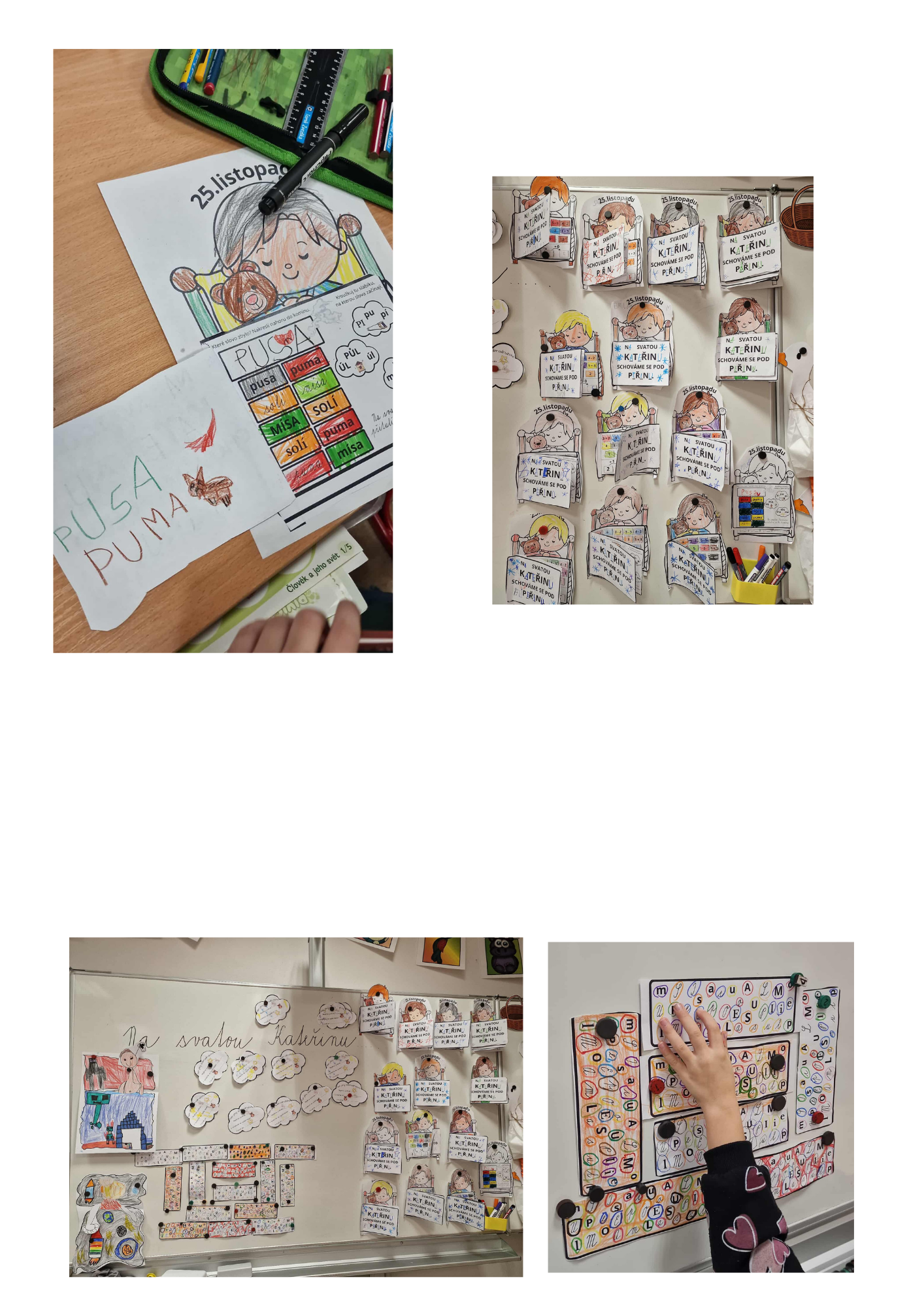Pojďme si opakovat ČJ a M tematicky se svatou KATEŘINOU a vytvořme pěknou výzdobu. Materiál obsahuje dítě v posteli a 2 části peřiny, které lepíme na dané místo - otáčíme jako knížečku. První je pranostika s vynechanými písmeny. V dalším najdeme další pranostiku o komínu, proto děti vykreslují v komíně stejně znějící slova, 1 slovo nemá trojici, toto slovo nakreslí nebo napíší na horní část komínu. V každém obláčku označí slabiku, na kterou začíná daný obrázek. Ve třetí části máme matematiku - děti vykreslují příklad a výsledek stejnou barvou a dole vypočítají řetězec. Součásti materiálu jsou dále cihle, ve kterých děti označují stejná písmena stejnou barvou, každý svoji cihlu vystřihne a společně tvoří komín. Vytvoří, že se z komínu kouří pomocí obláčku, kde najdeme úkoly k přiložené povídce.