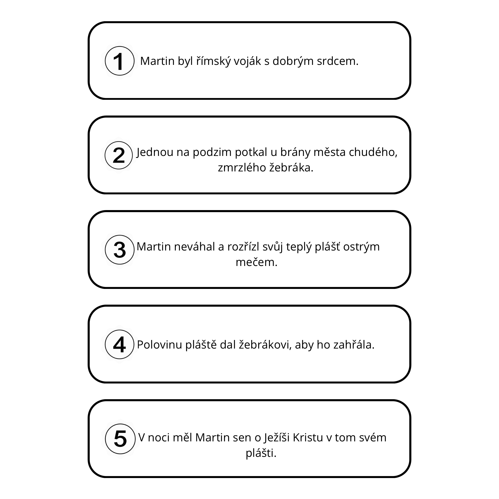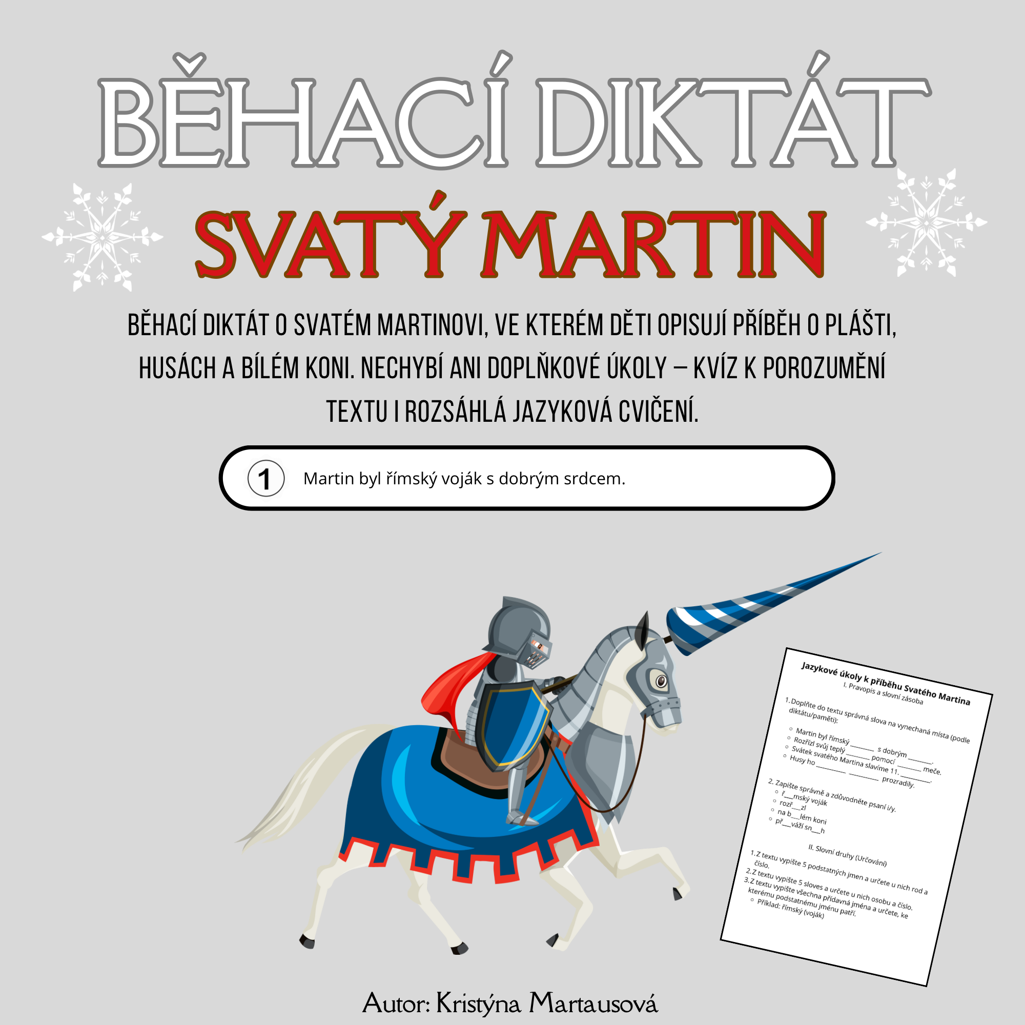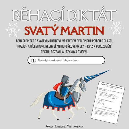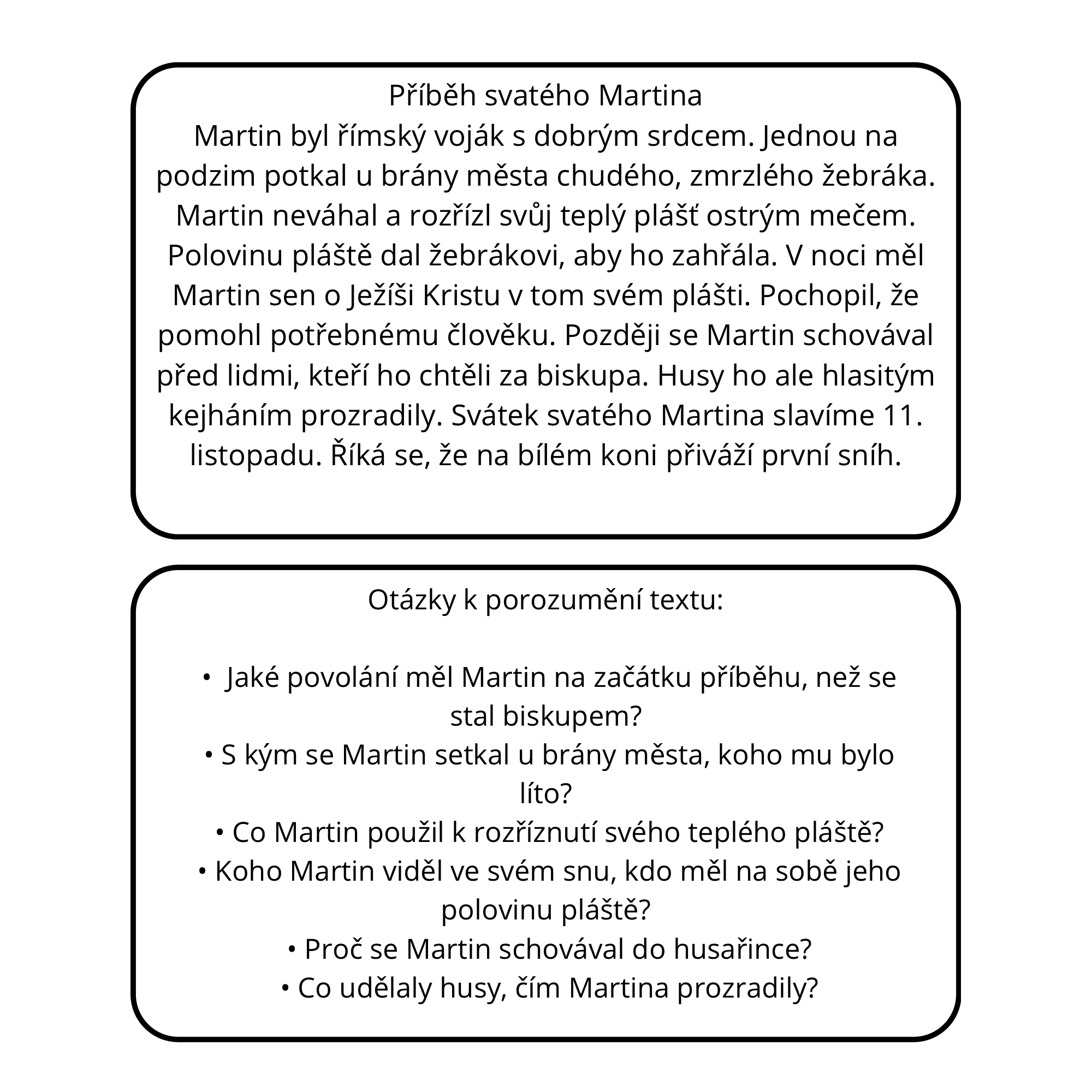 Běhací diktát o svatém Martinovi, ve kterém děti opisují příběh o plášti, husách a bílém koni.