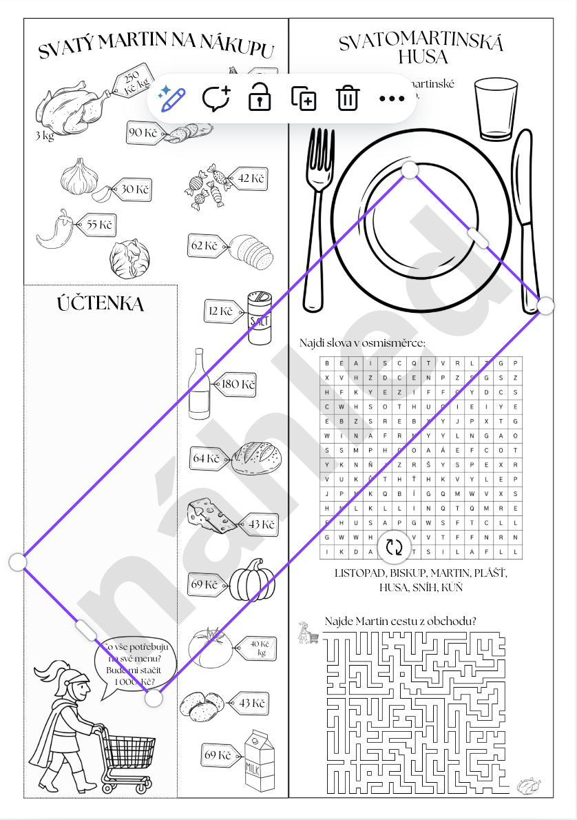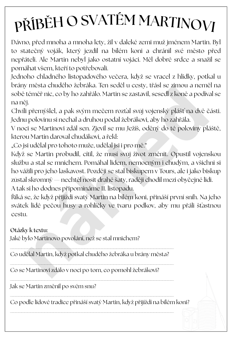 Děti si přečtou příběh o sv. Martinovi, odpoví na otázky z textu, luští osmisměrku a počítají, jestli jim na svatomartinské menu vystačí 1000 Kč.