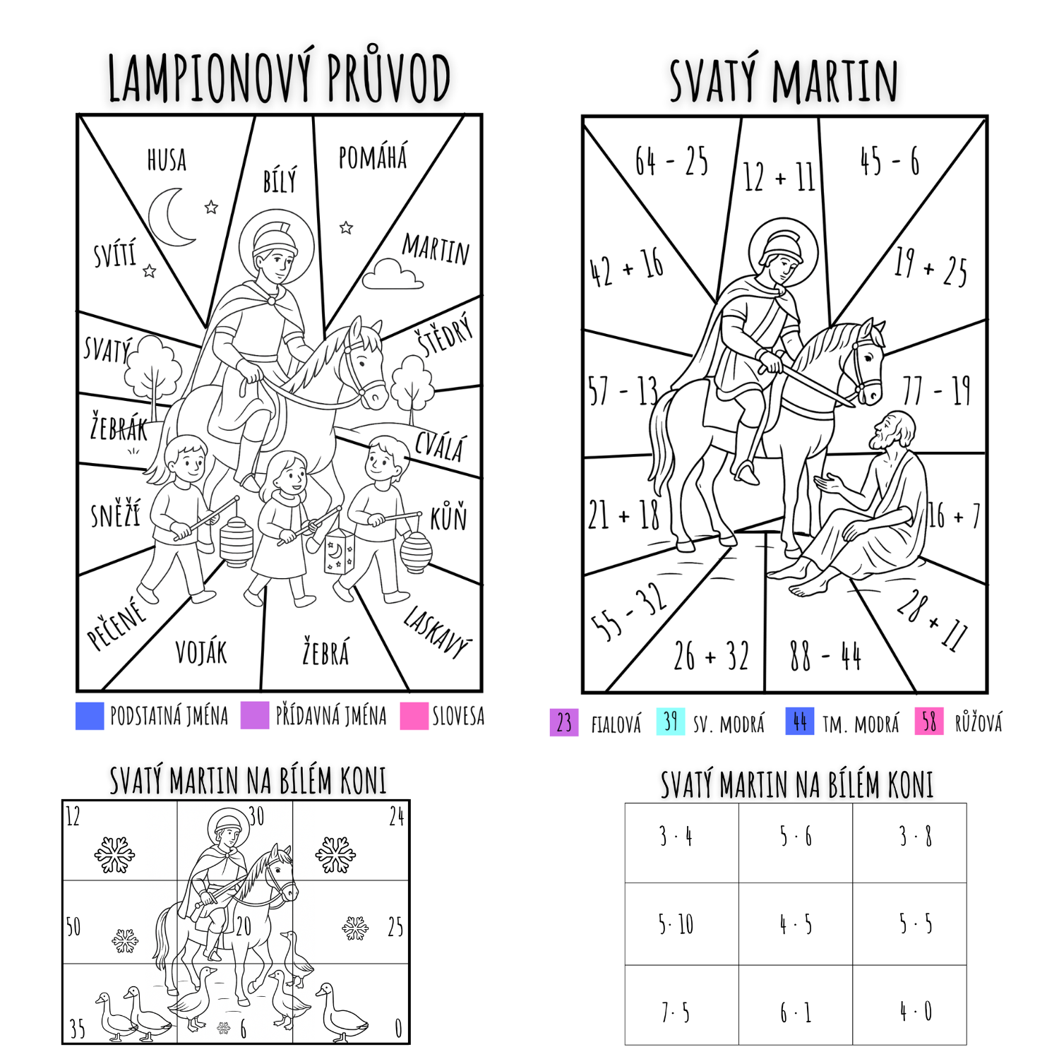 Úkol: Žáci rozstříhají omalovánku, řeší příklady malé násobilky (násobení) a podle výsledků lepí části obrázku. Nakonec obrázek vybarví, vzniká tematický motiv sv. Martina.