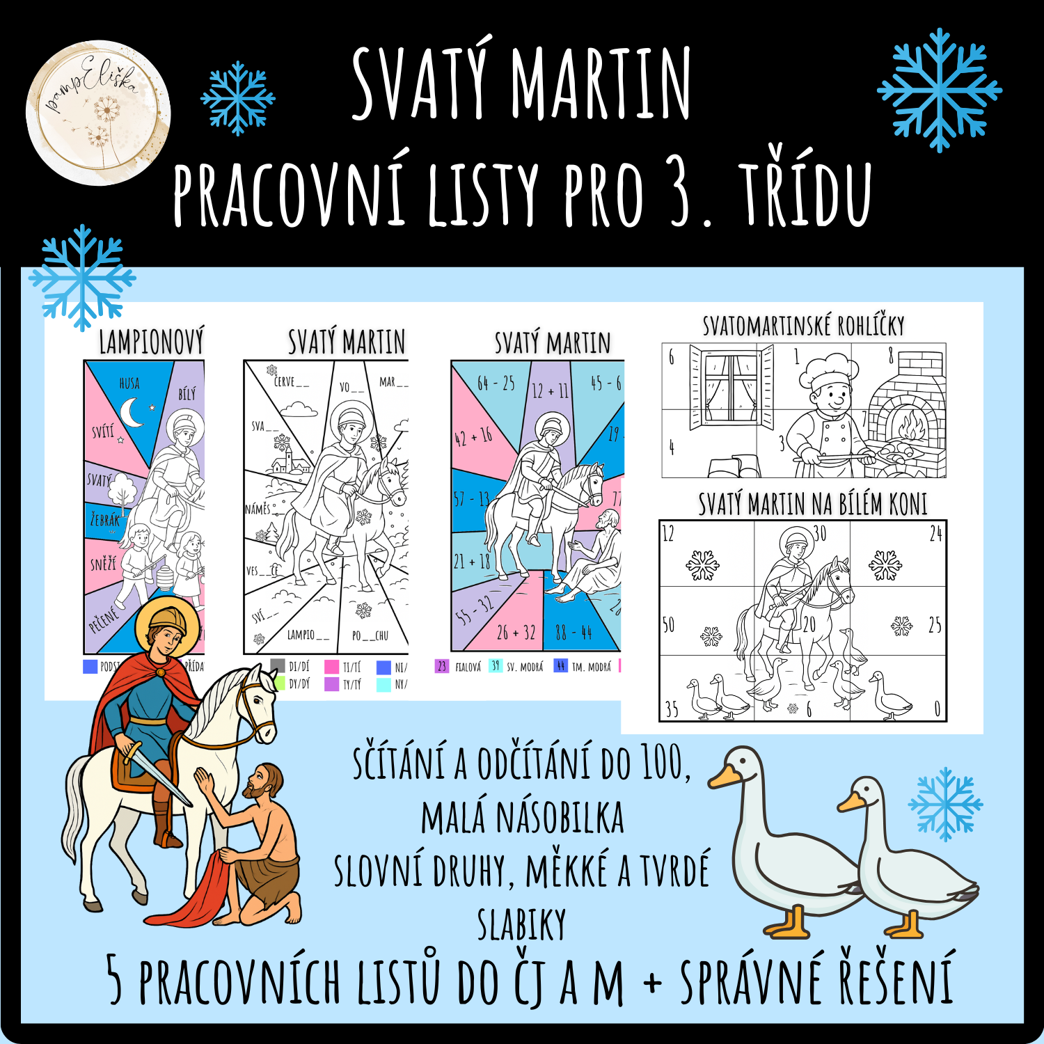 Úkol: Žáci rozstříhají omalovánku, řeší příklady malé násobilky (dělení) a podle výsledků lepí části obrázku. Nakonec obrázek vybarví, vzniká tematický motiv sv. Martina.