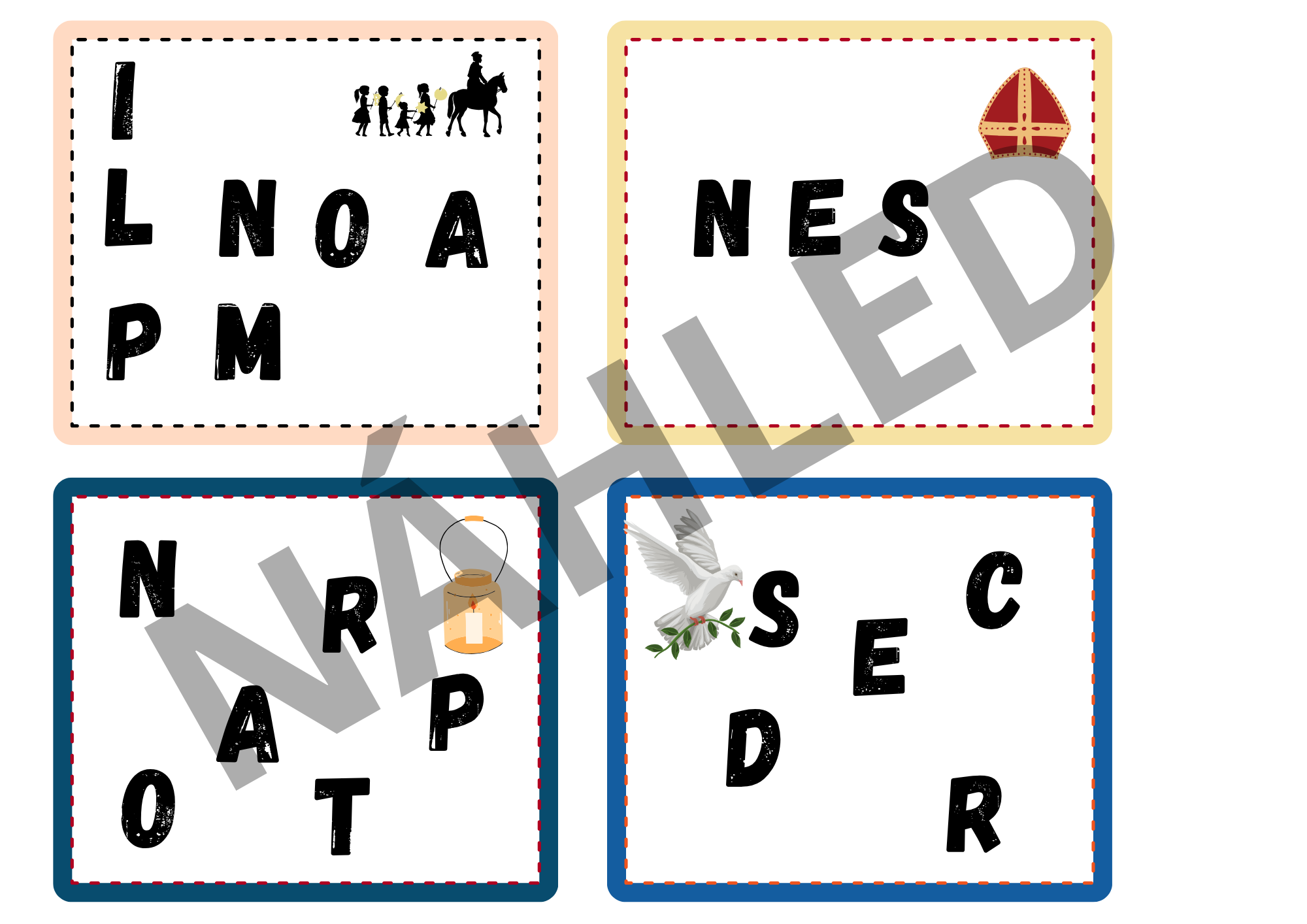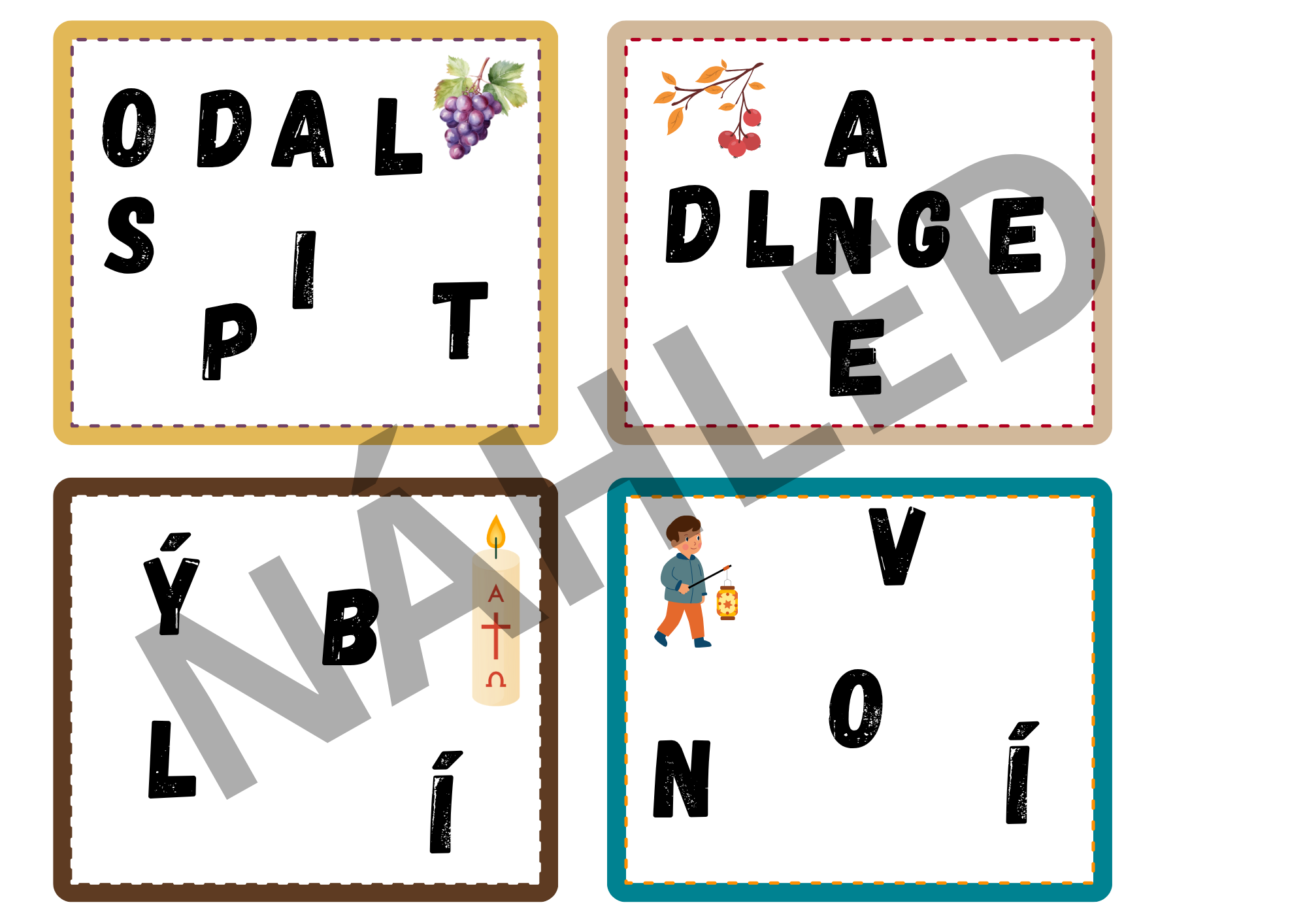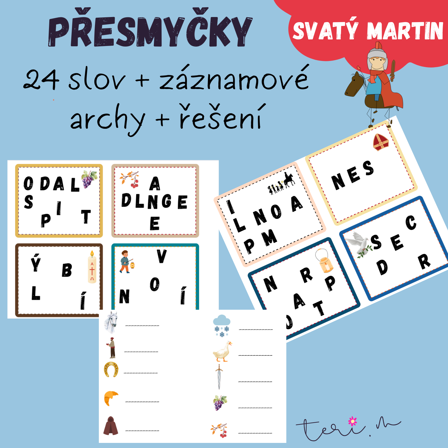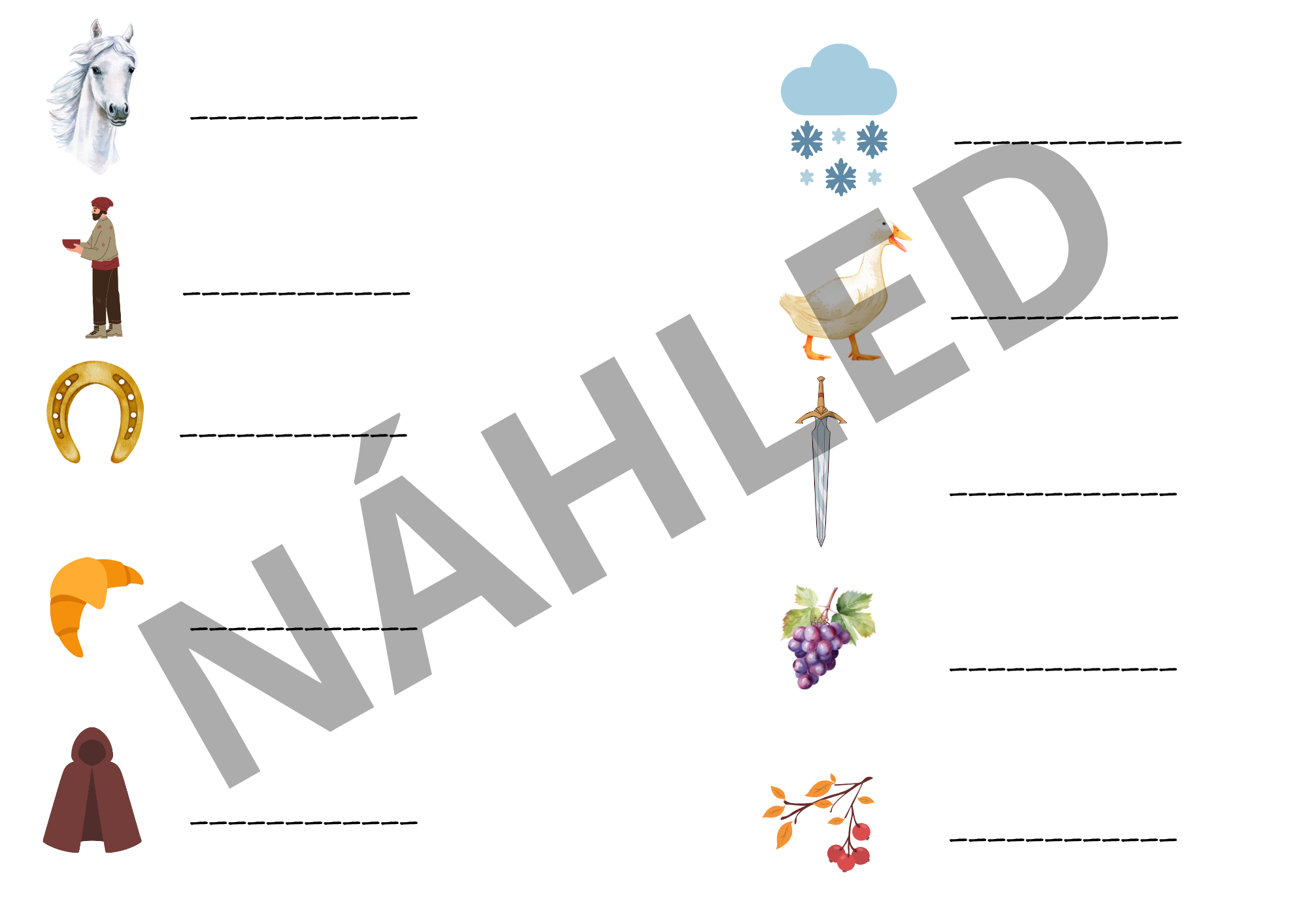 - 24 slov ukrytých v přesmyčkách (např. kůň, husa, plášť, sníh, legenda…)