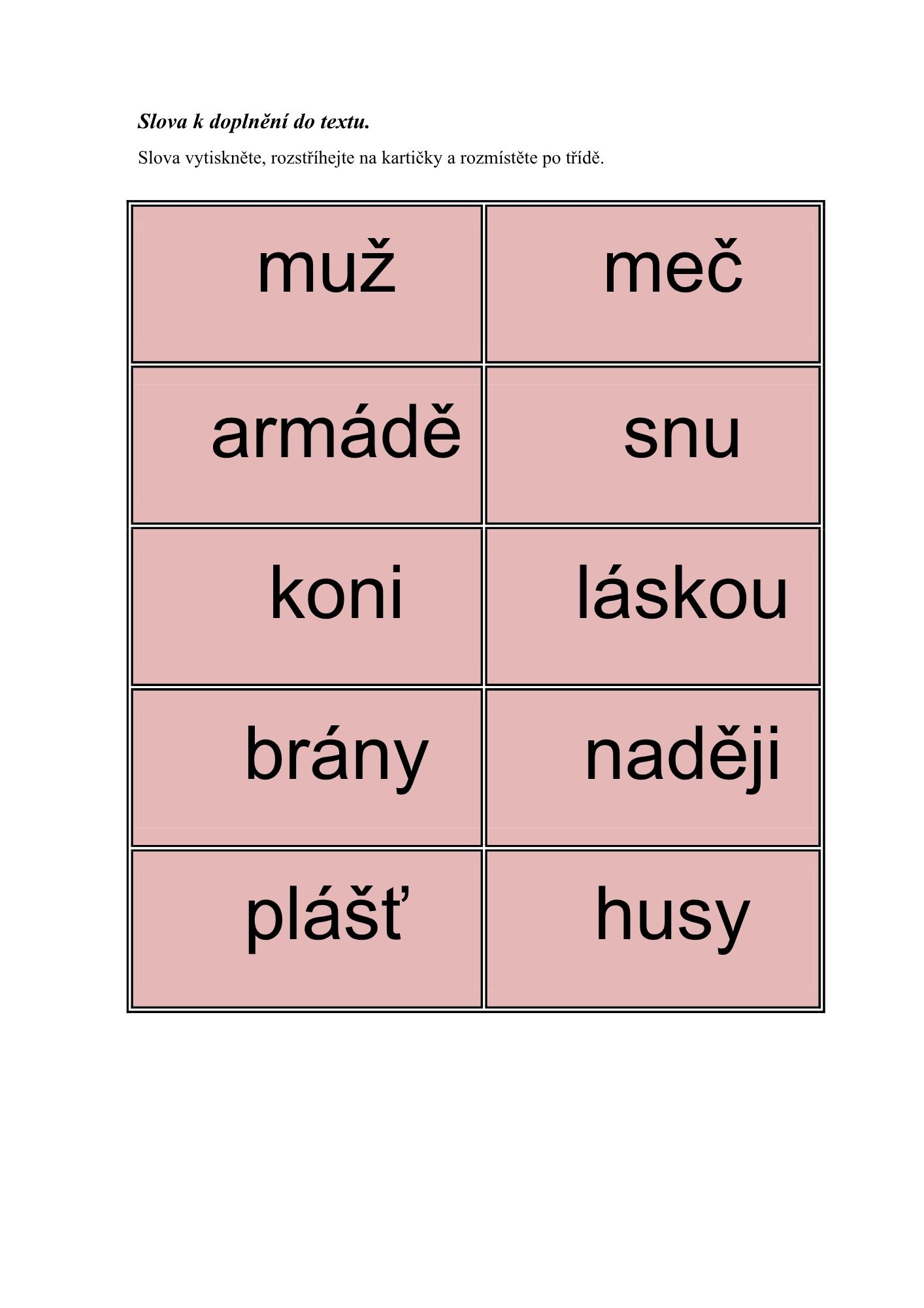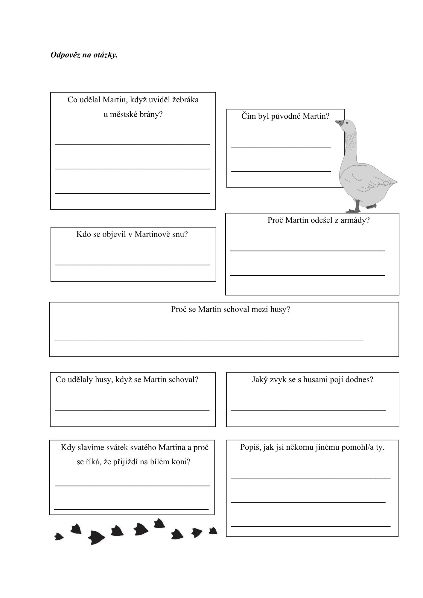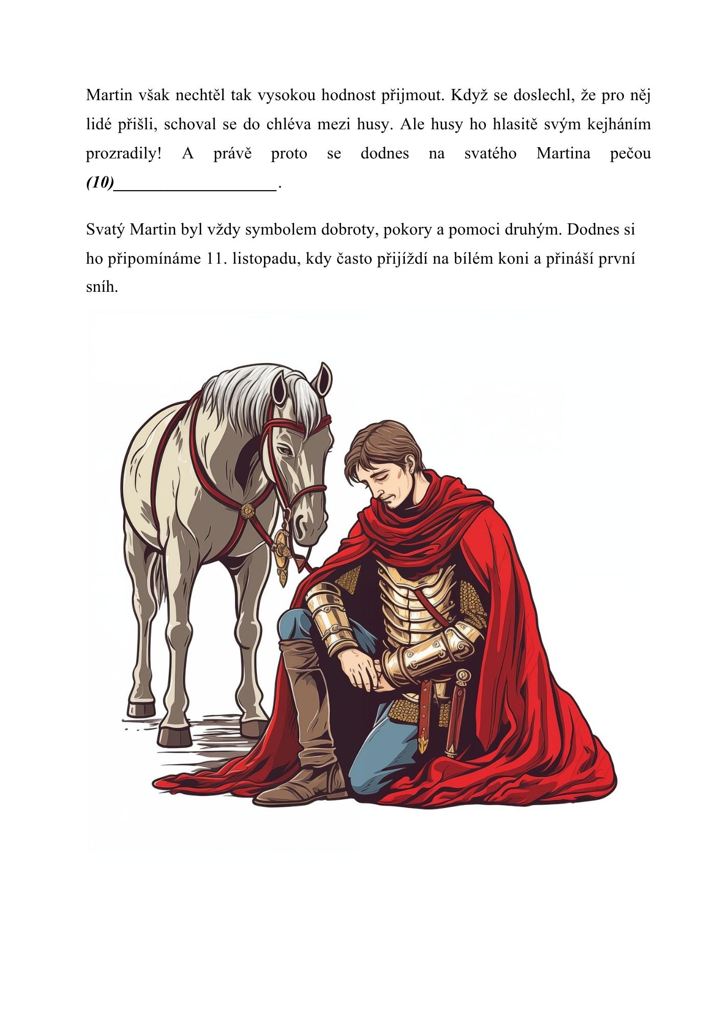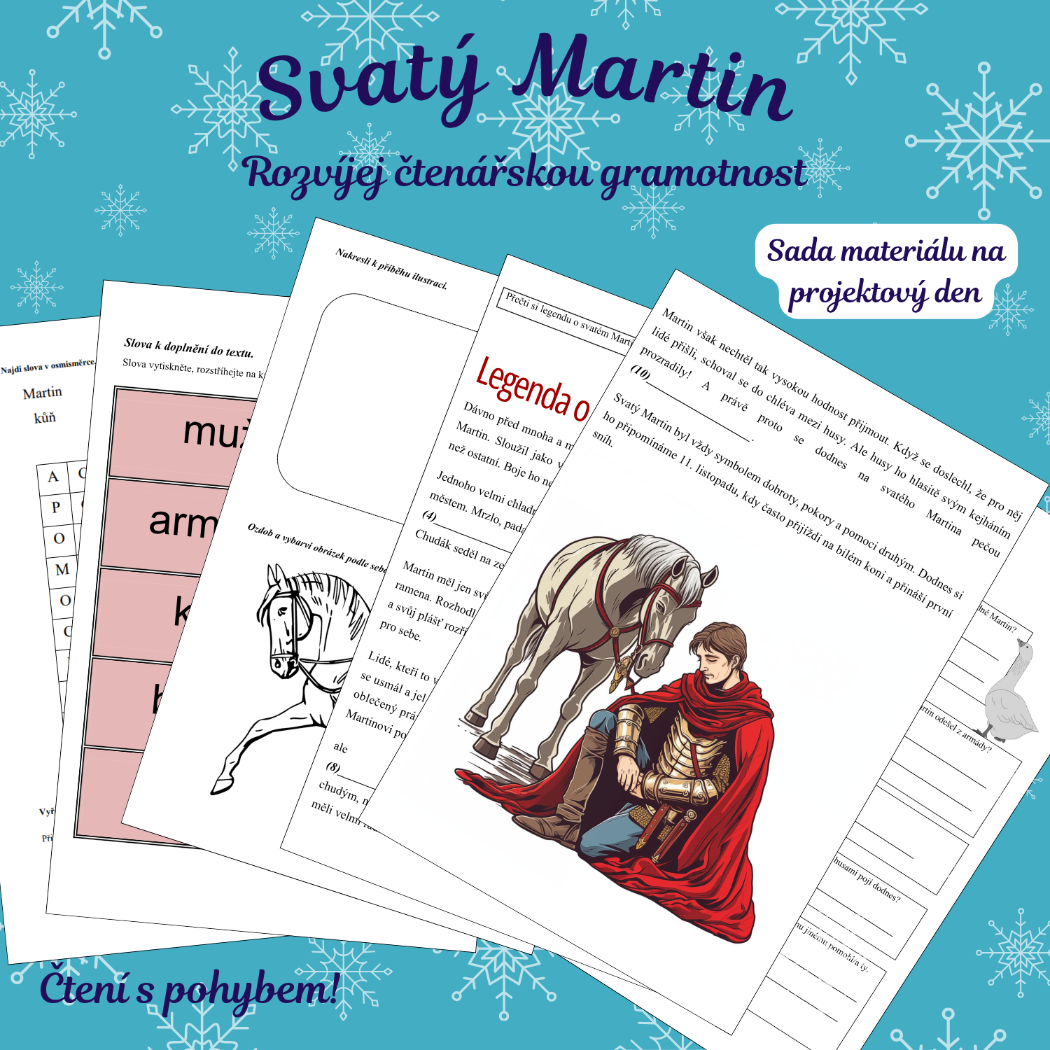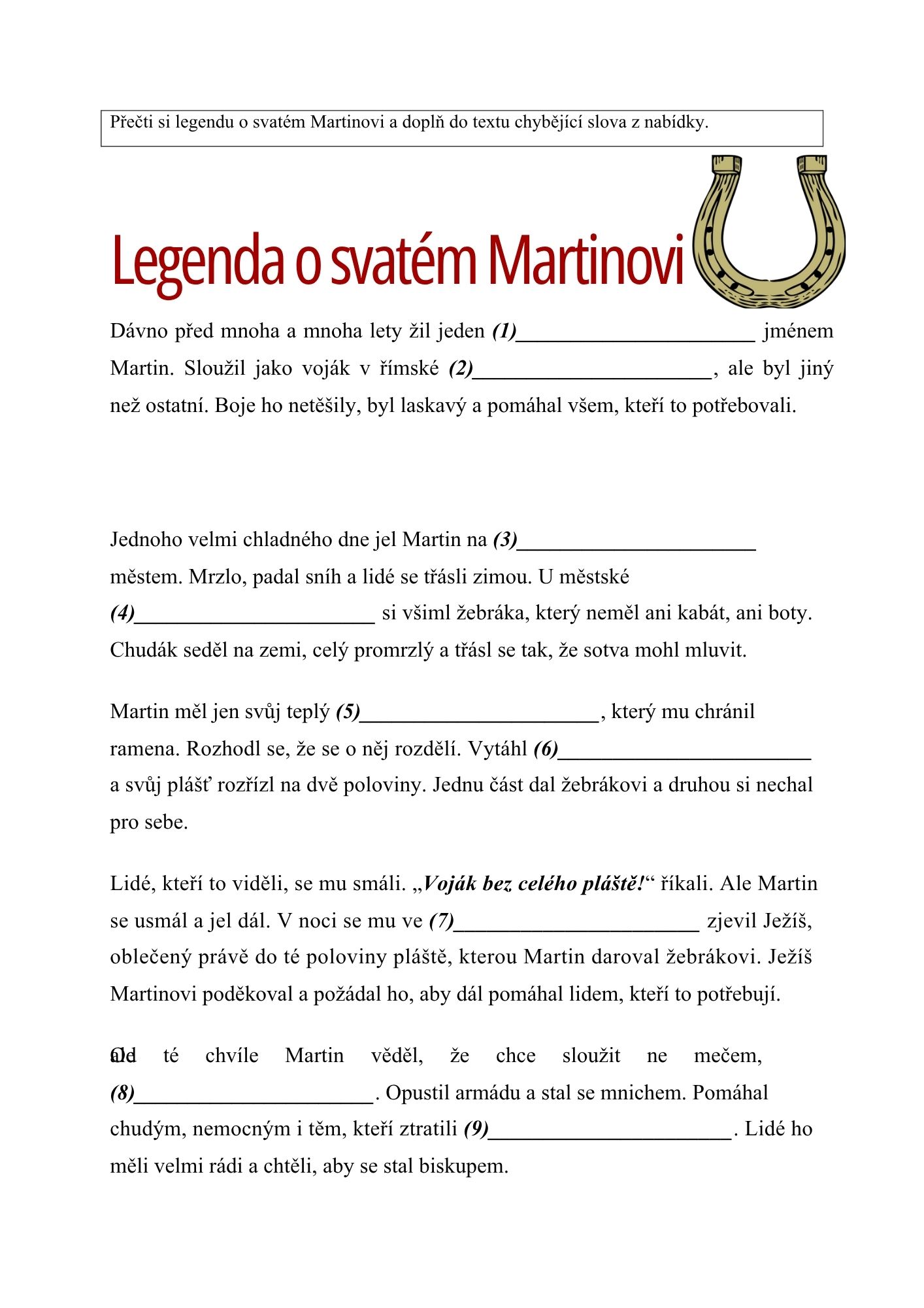 Pracovní listy obsahují text zaměřený na příběh o svatém Martinovi. Texty jsou doplněny o chybějící slova, která žáci aktivně vyhledávají na kartičkách rozmístěných po třídě.