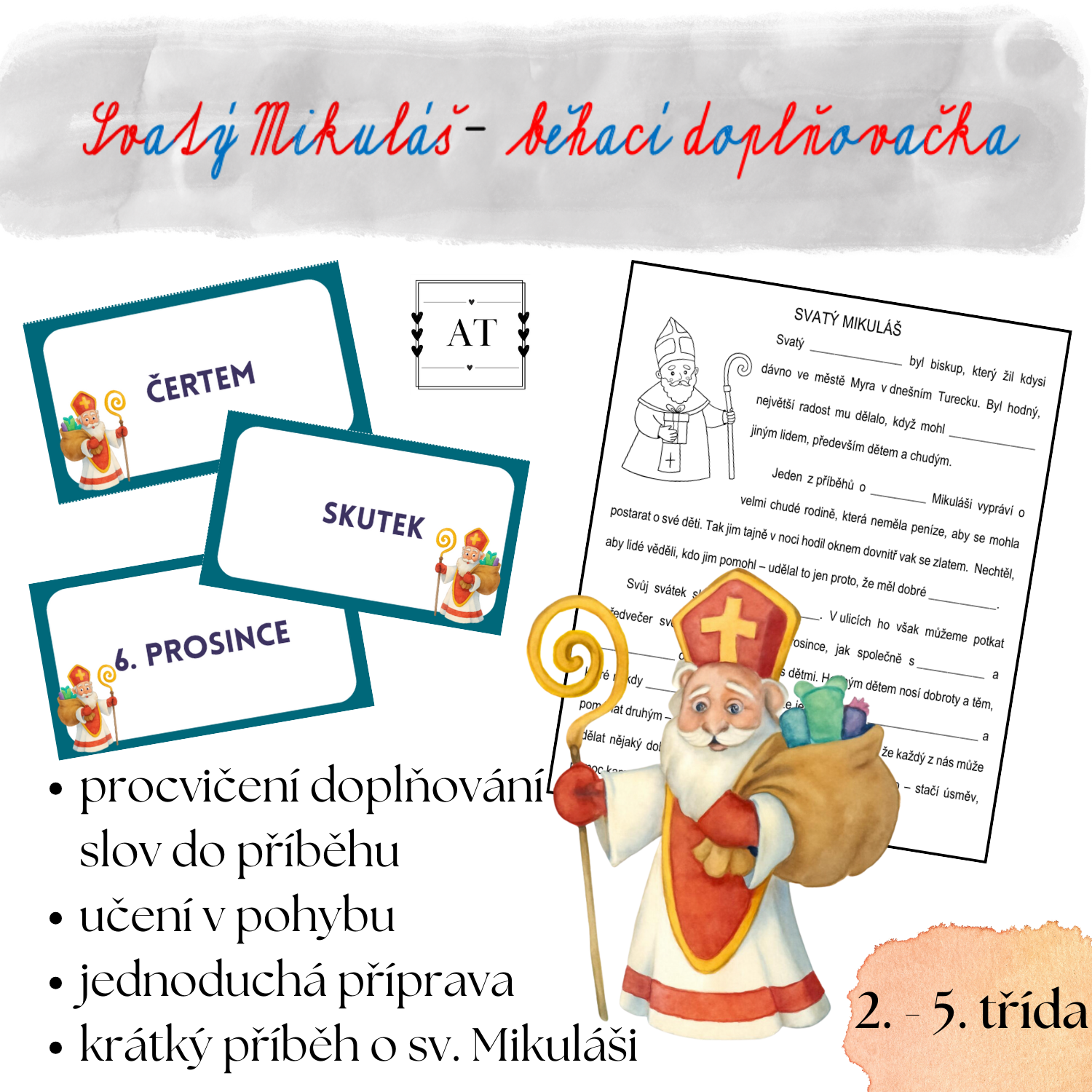 Oblíbená běhací doplňovačka zaměřená na téma svatého Mikuláše a informace o jeho životě. Úkolem žáků je hledat rozmístěné kartičky po třídě/chodbě/zahradě a vhodně doplnit do vynechávek v textu.