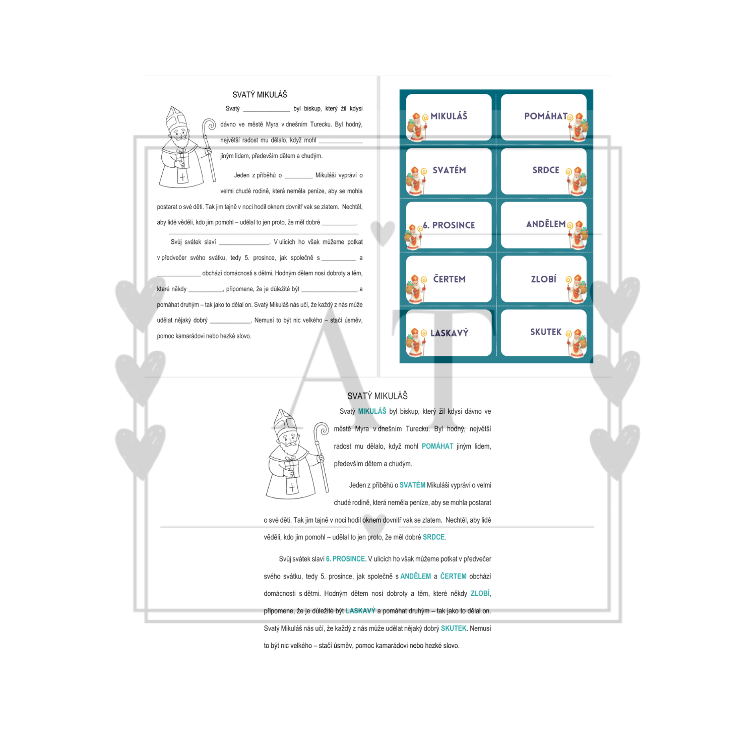 Žáci se zároveň hravou formou dozví stručné informace svatém Mikuláši. Součástí doplňovačky je metodická příručka, pracovní list k doplňování, kartičky k rozmístění v prostoru, omalovánka a kontrolní list.