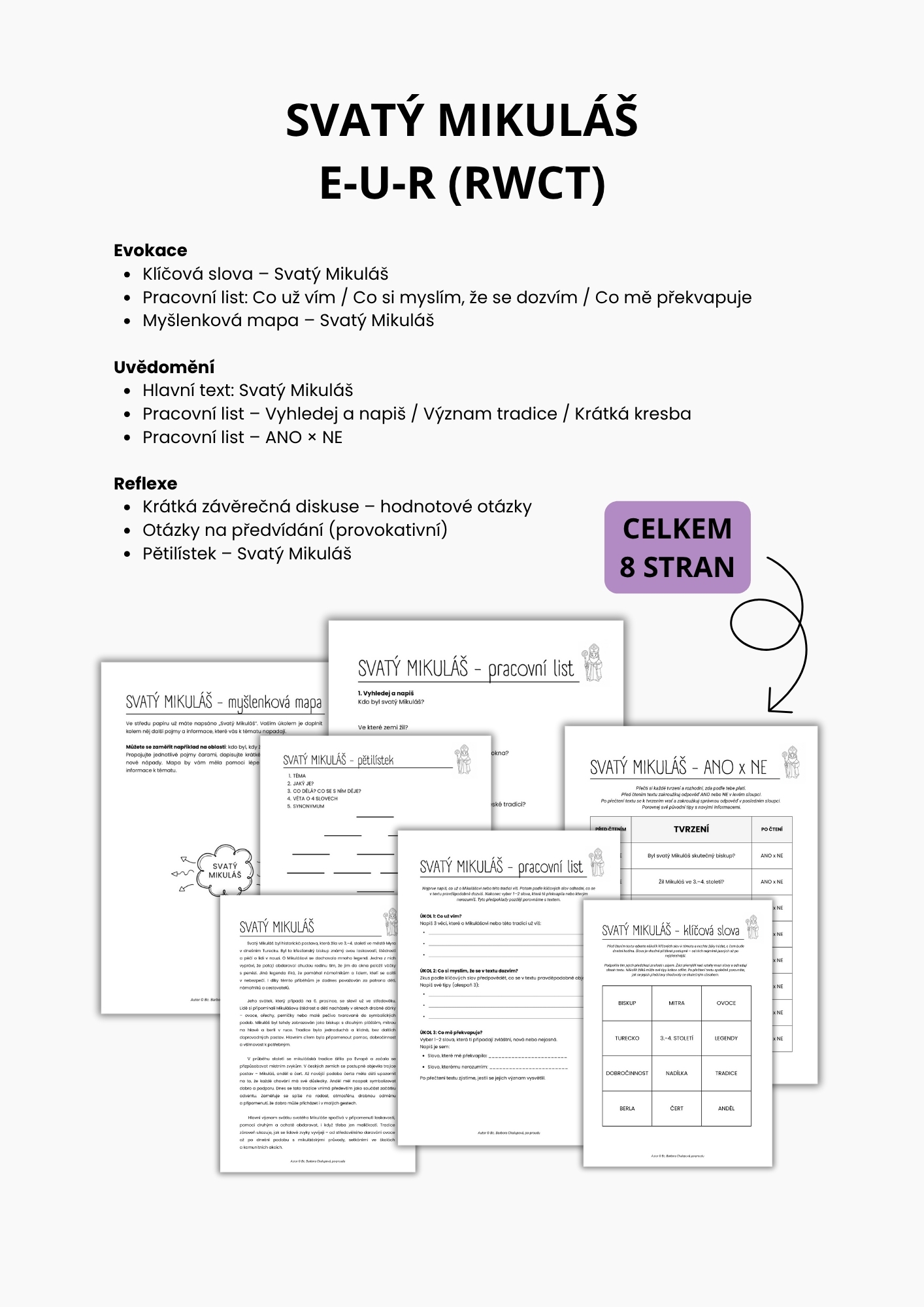 Přehledně vedená čtenářská lekce, která propojuje tradici svatého Mikuláše, práci s informacemi a metodu E–U–R. Děti čeká aktivní čtení, předvídání, práce s textem i závěrečná reflexe. Celá lekce vede k pochopení, kdo Mikuláš skutečně byl, jak vznikla tradice a proč má dodnes důležitý hodnotový přesah. ✨