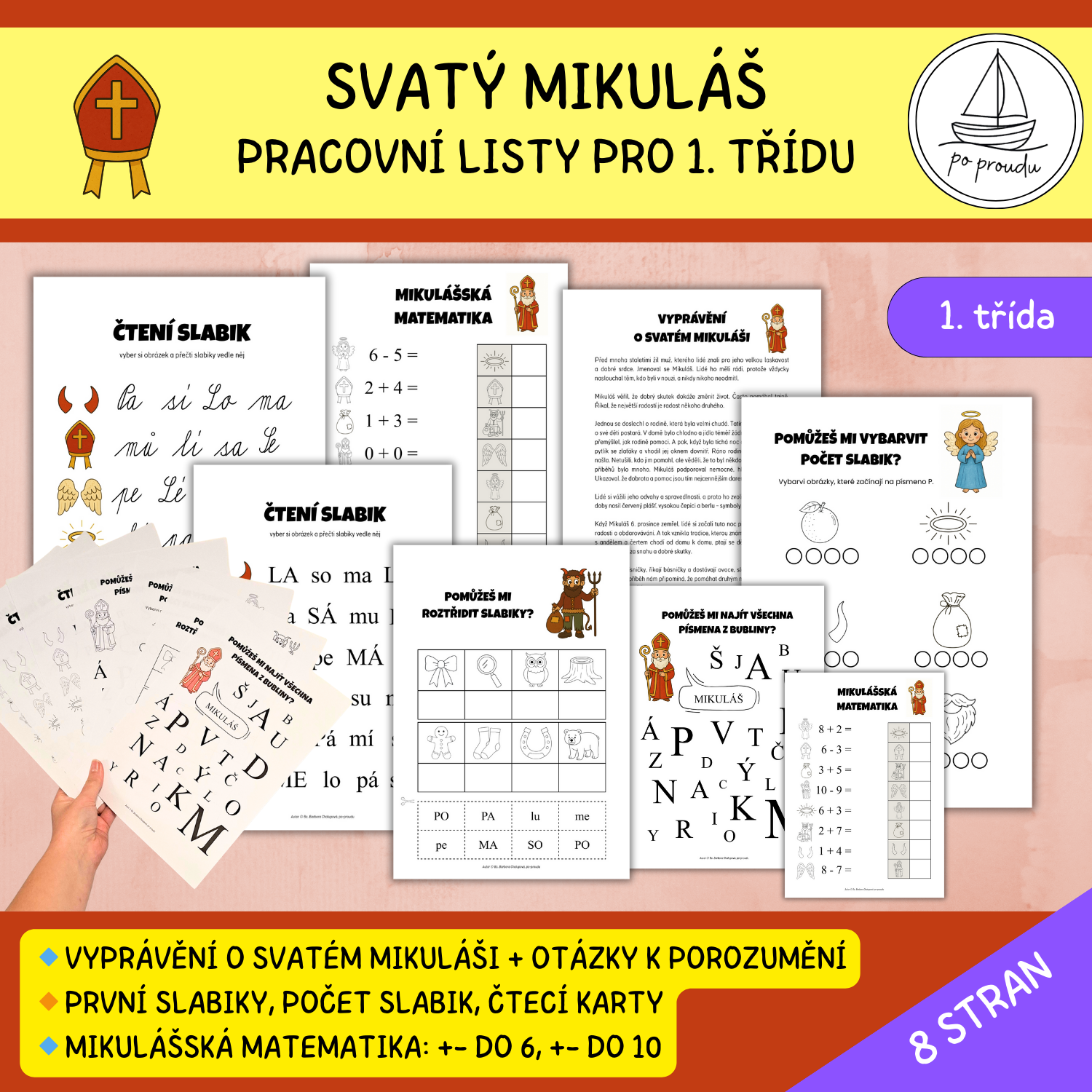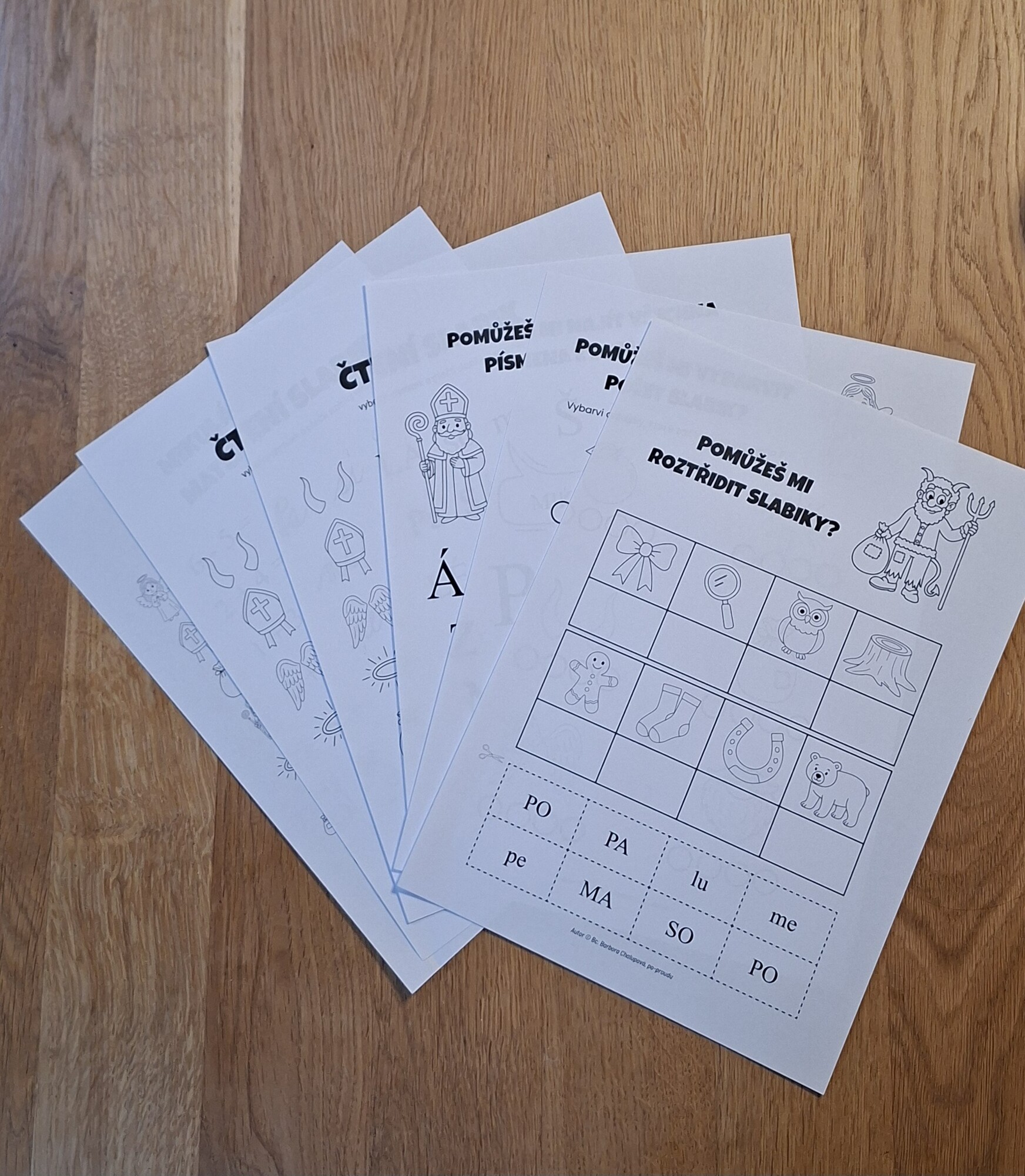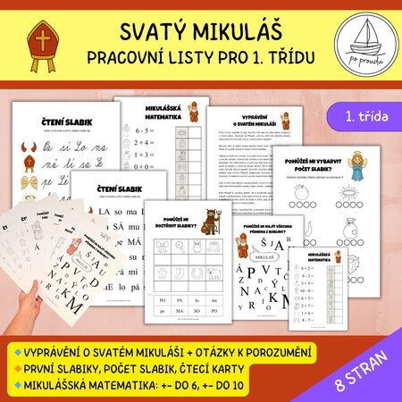 Tematické pracovní listy vytvořené přímo pro prvňáčky. Materiál propojuje čtení, jazyková cvičení i jednoduchou matematiku s atmosférou svatého Mikuláše.