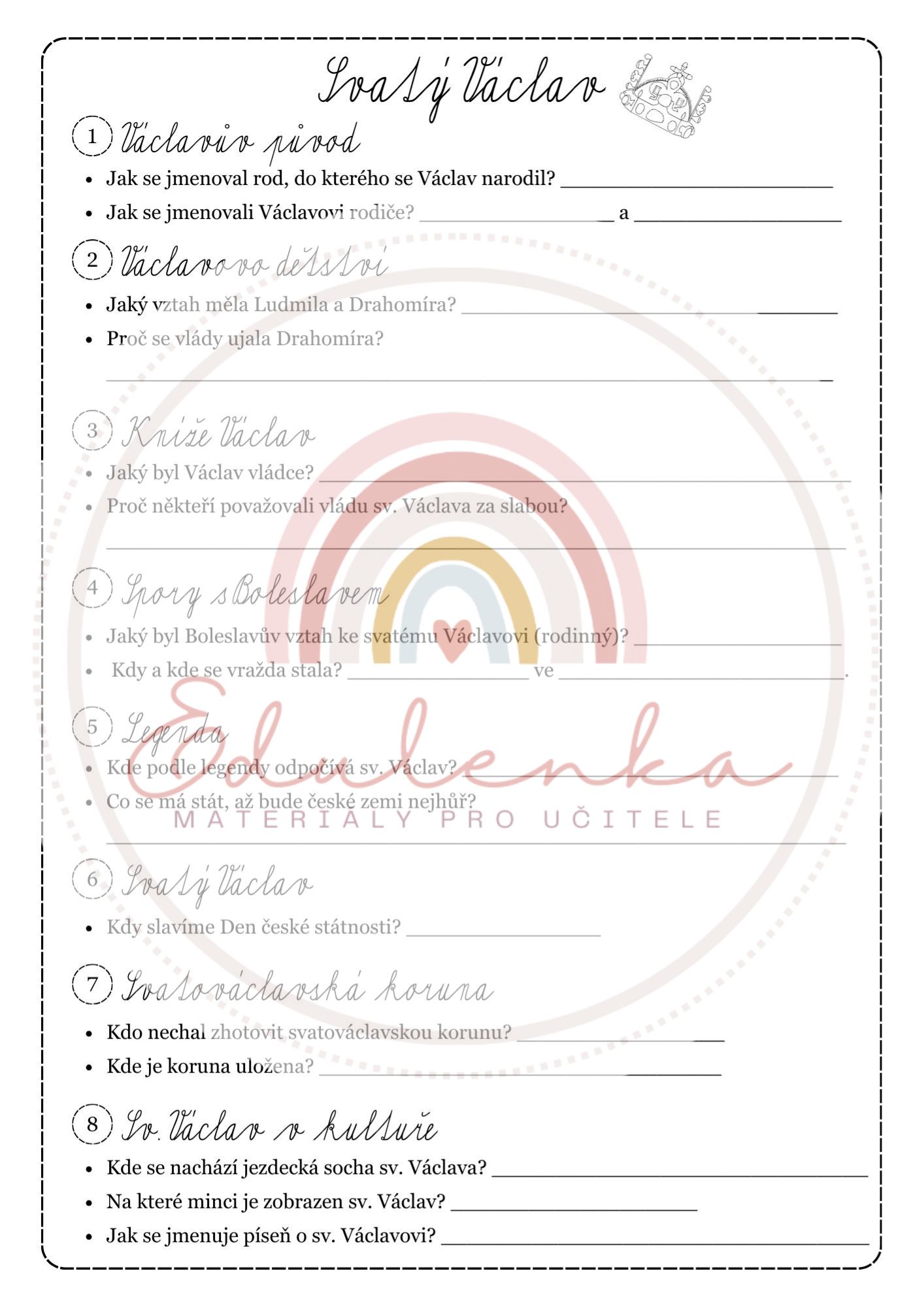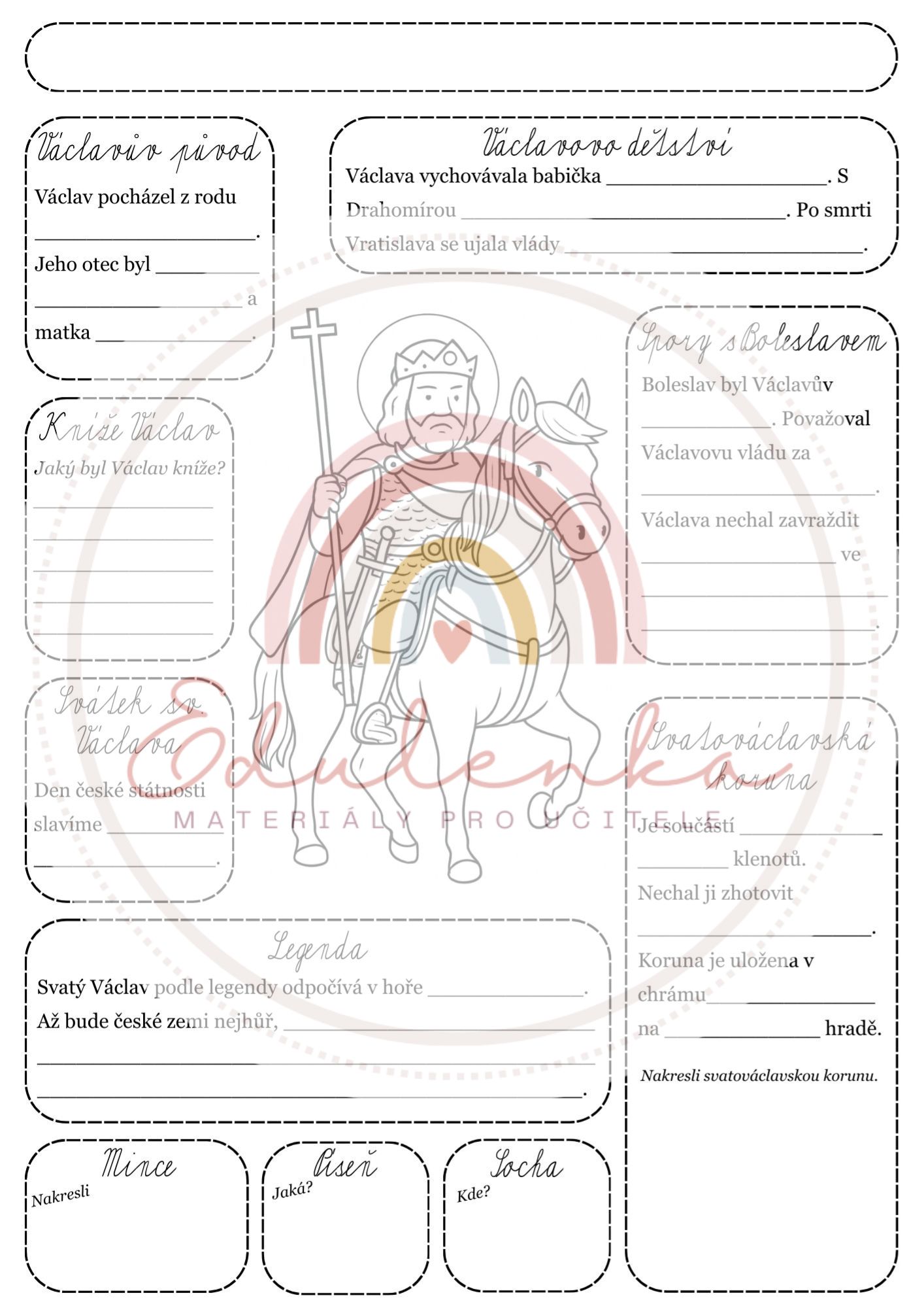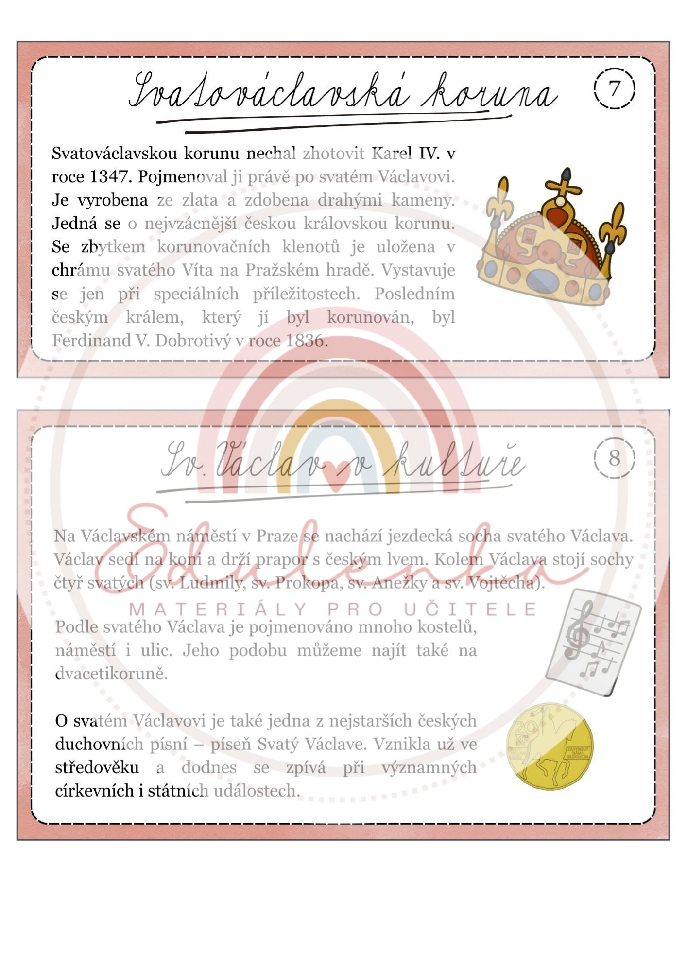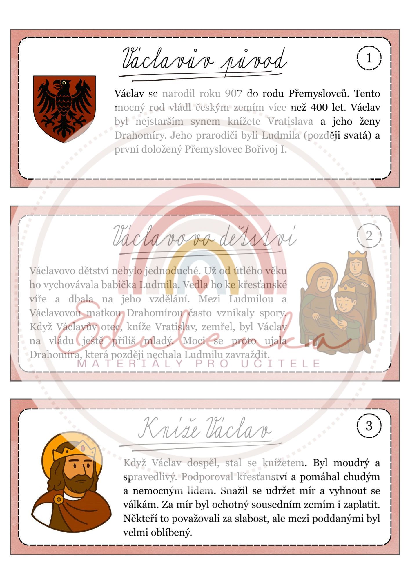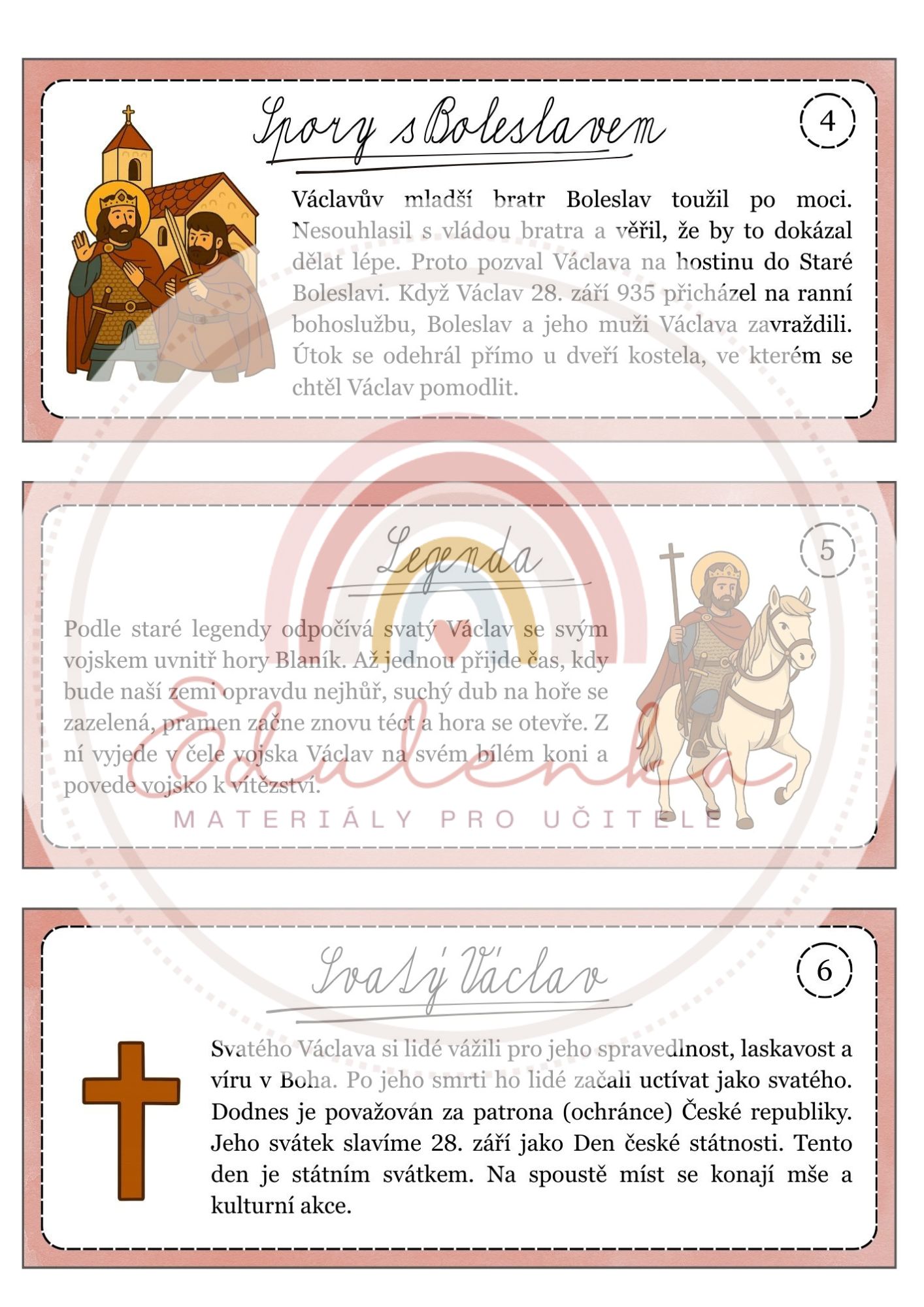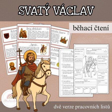 Běhací čtení na téma svatý Václav obsahuje 8 karet ke čtení o životě, smrti a odkazu sv. Václava a dvě verze pracovního listu.