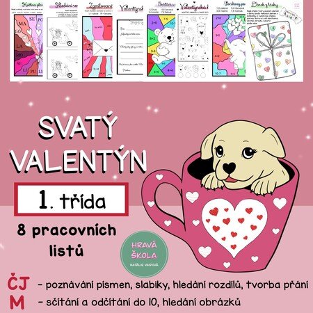 ❤️MATERIÁL obsahuje 8 PL s TEMATIKOU SVATÉHO VALENTÝNA do ČJ a M pro 1. TŘÍDU ❤️