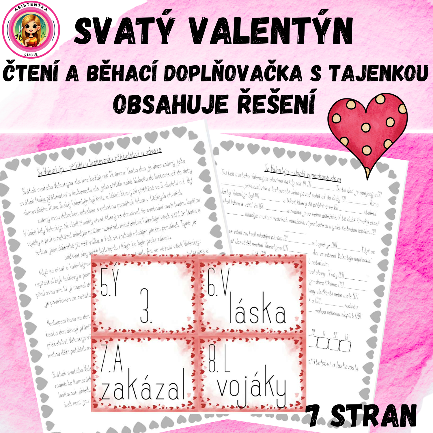 Postupným skládáním písmen vznikne tajenka, která zní: „Svatý Valentýn je symbolem lásky, přátelství a laskavosti.“ Aktivita rozvíjí čtení s porozuměním, slovní zásobu, logické uvažování i schopnost práce s textem. Zároveň podporuje hodnoty jako laskavost, empatie, přátelství a pozitivní vztahy mezi spolužáky. Práci lze realizovat individuálně, ve dvojicích nebo ve skupinách, podle věku a schopností žáků. Materiál je vhodný jako tematická aktivita v období kolem 14. února, ale také jako obecné připomenutí důležitosti laskavého chování a dobrých mezilidských vztahů během celého roku.