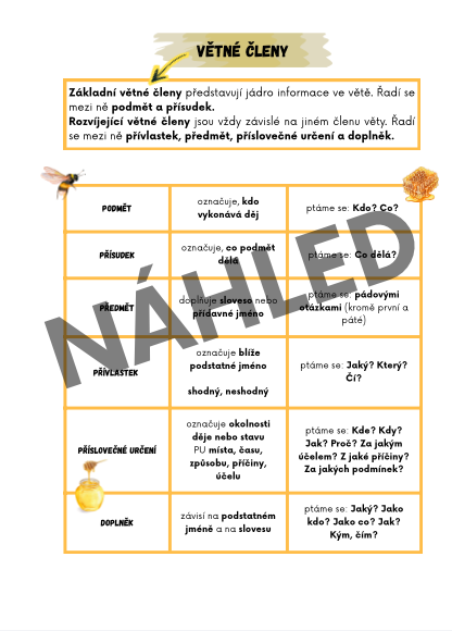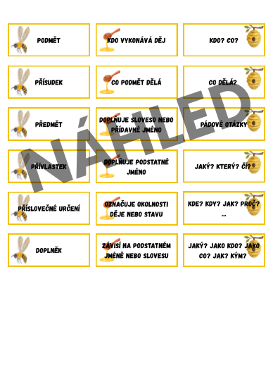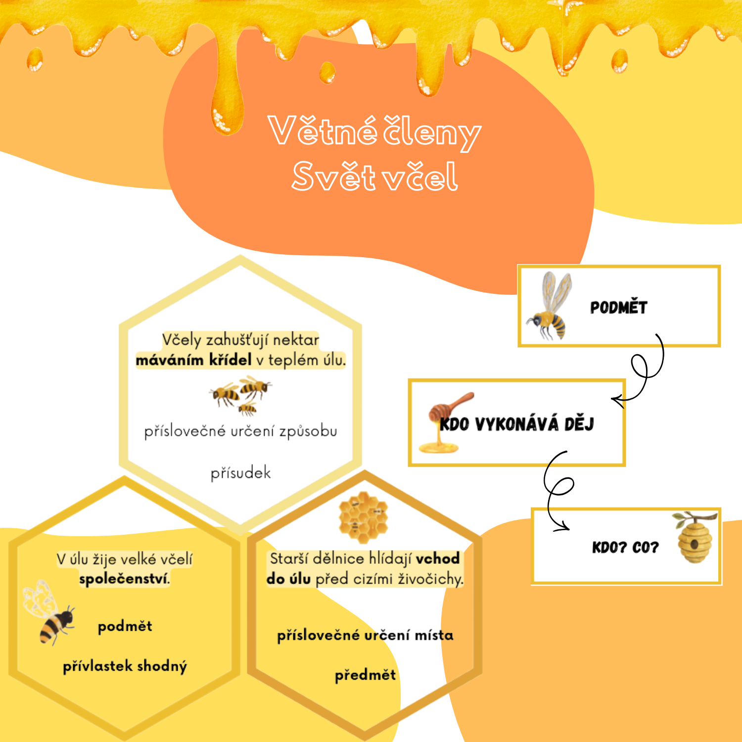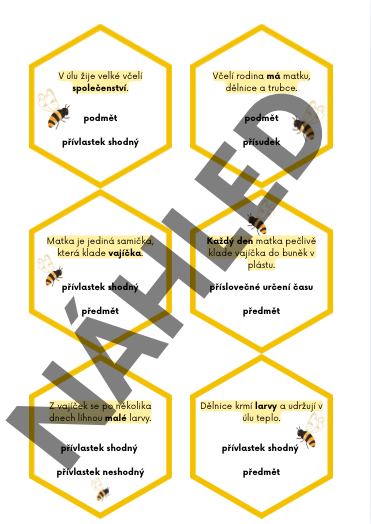 Dále materiál obsahuje 30 kartiček, kde žáci určují větný člen u zvýrazněného slova a mohou si ho zkontrolovat prostřednictvím řešením z druhé strany. Větné členy určují ve větách, které jsou o včelách a vzniku medu.