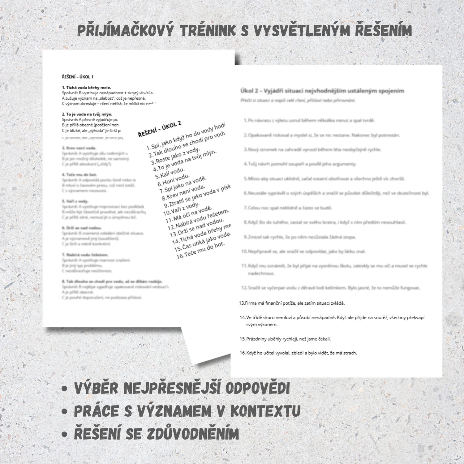 Materiál propojuje téma Světového dne vody s cílenou přípravou na přijímačky z českého jazyka. Zaměřuje se na porozumění ustáleným spojením s vodou (rčení, přísloví, přirovnání) a jejich přesné použití v kontextu.