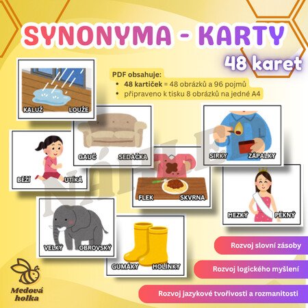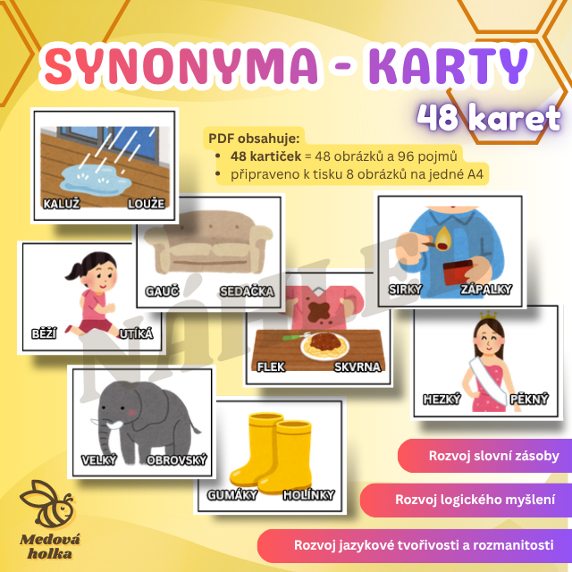 Synonyma dětem ukazují, že jedna myšlenka se dá vyjádřit různými způsoby - že „hezký“ může být také „pěkný“ a „chytrý“ třeba „moudrý“. Práce s kartičkami podporuje jazykovou tvořivost, obohacuje vyjadřování a vede děti k větší přesnosti i rozmanitosti ve vyjadřování.