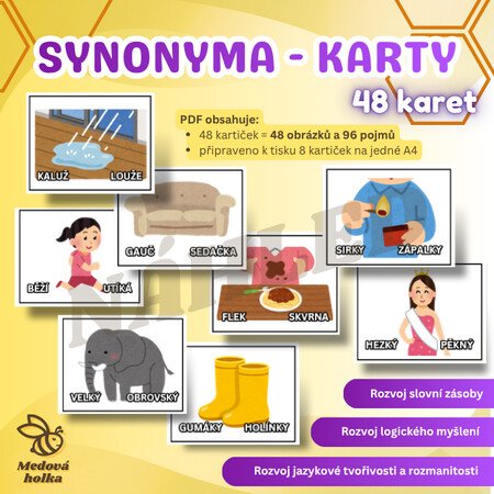Materiál můžete zakoupit také v rámci zvýhodněné sady Sada pro rozvoj slovní zásoby - synonyma, antonyma, homonyma, kde naleznete celkem 200+ kartiček 🤩