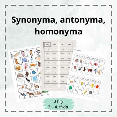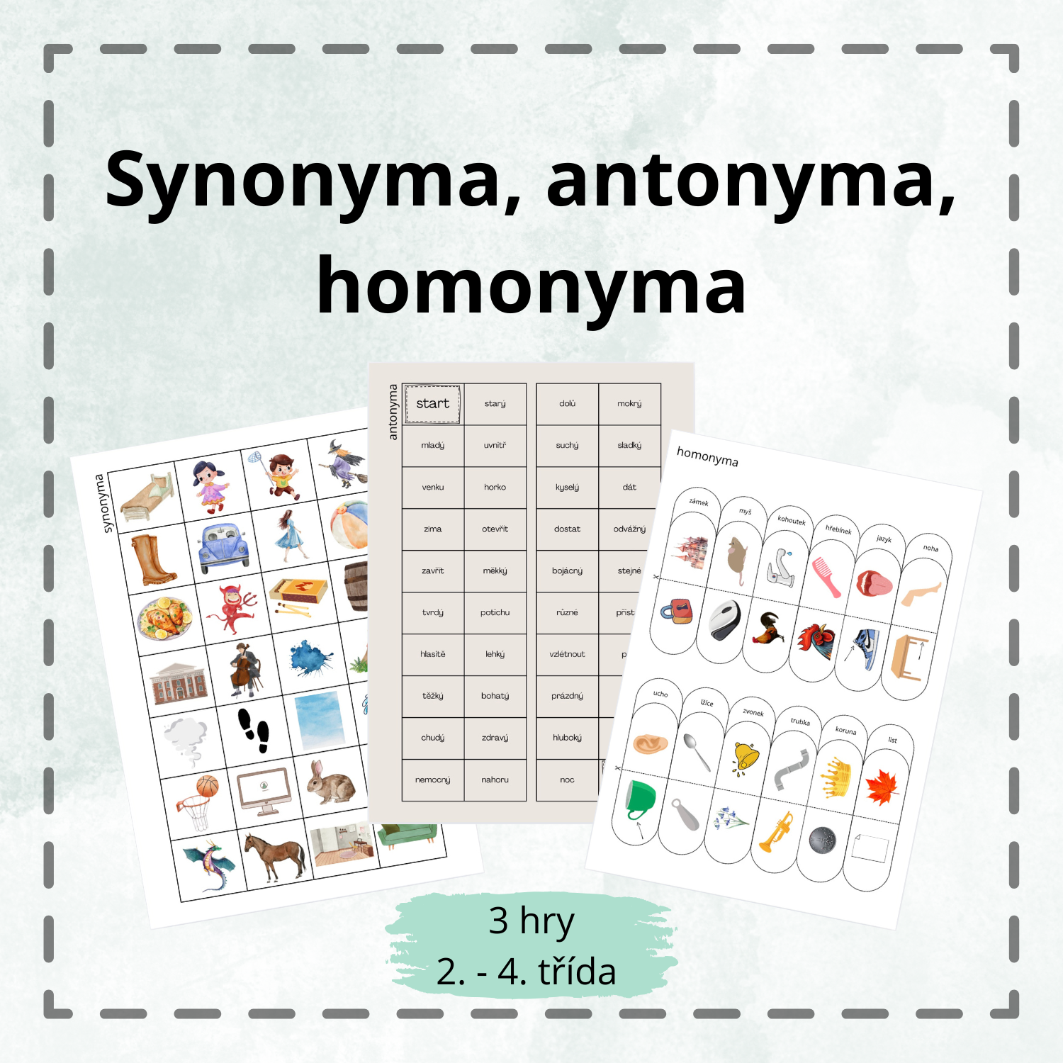 Materiál obsahuje procvičování synonym (přiřazování trojic), antonym (domino) a homonym (přiřazování dvojic).