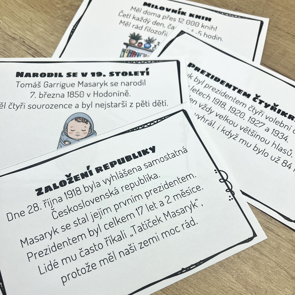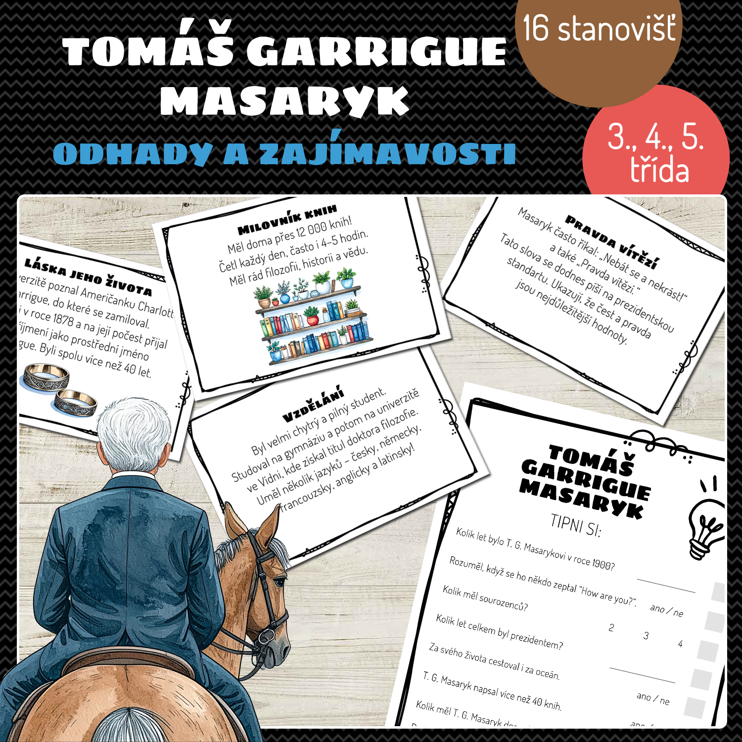 Žáci si tipují odpovědi na 8 otázek o T. G. Masarykovi. Následně hledají odpovědi na tyto otázky na kartičkách, které jsou rozmístěné po třídě.