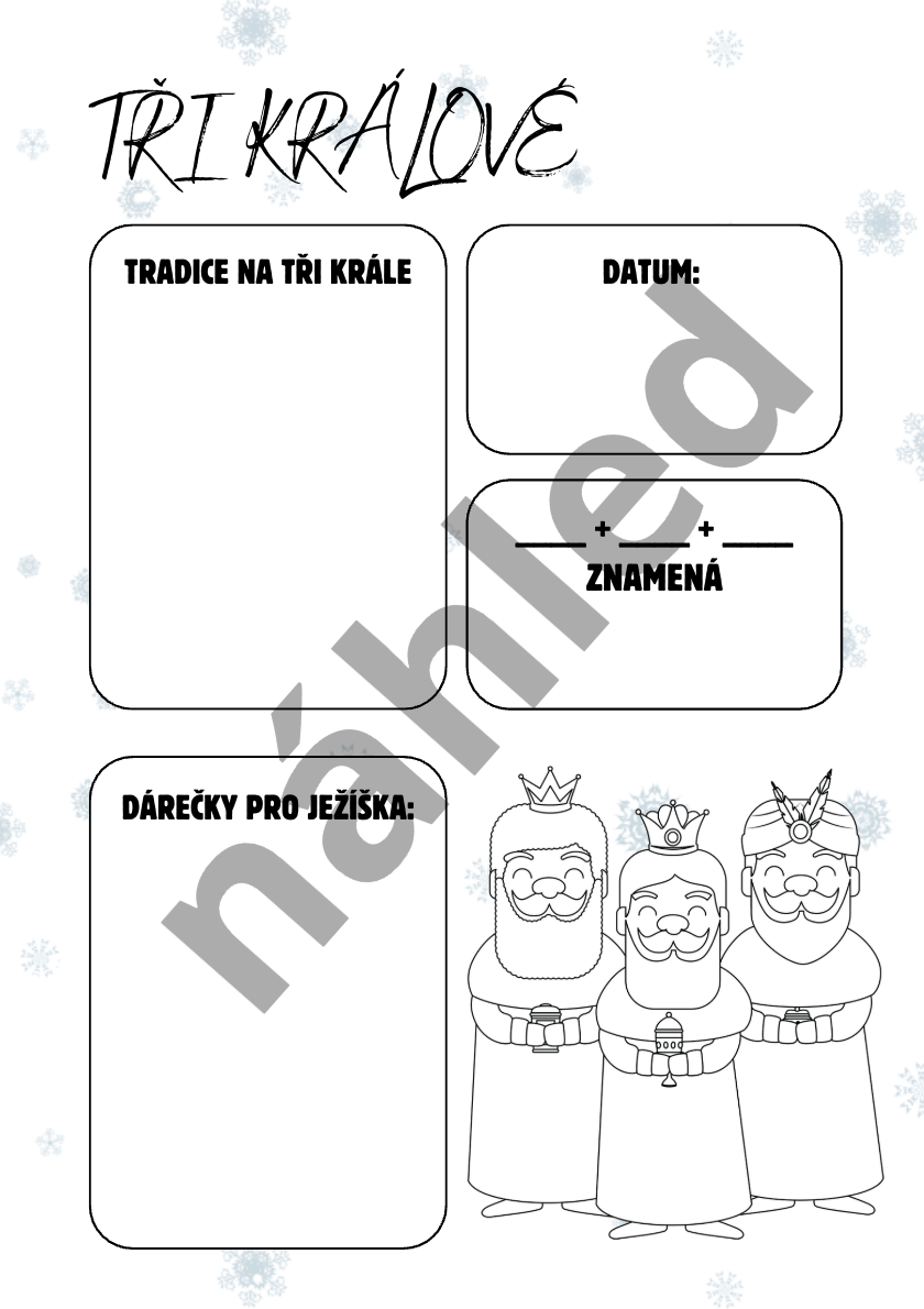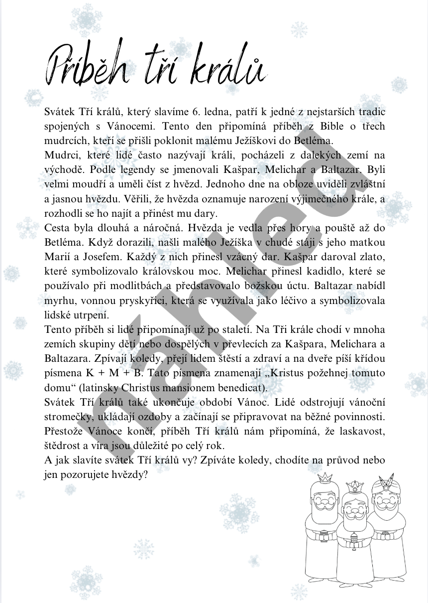 Pracovní listy k tradičnímu svátku Tří králů zaměřené na čtení s porozuměním a porozumění významu tradic. Žáci se seznámí s biblickým příběhem tří mudrců, jejich cestou do Betléma, symbolikou darů i s tím, proč svátek Tří králů uzavírá vánoční období.