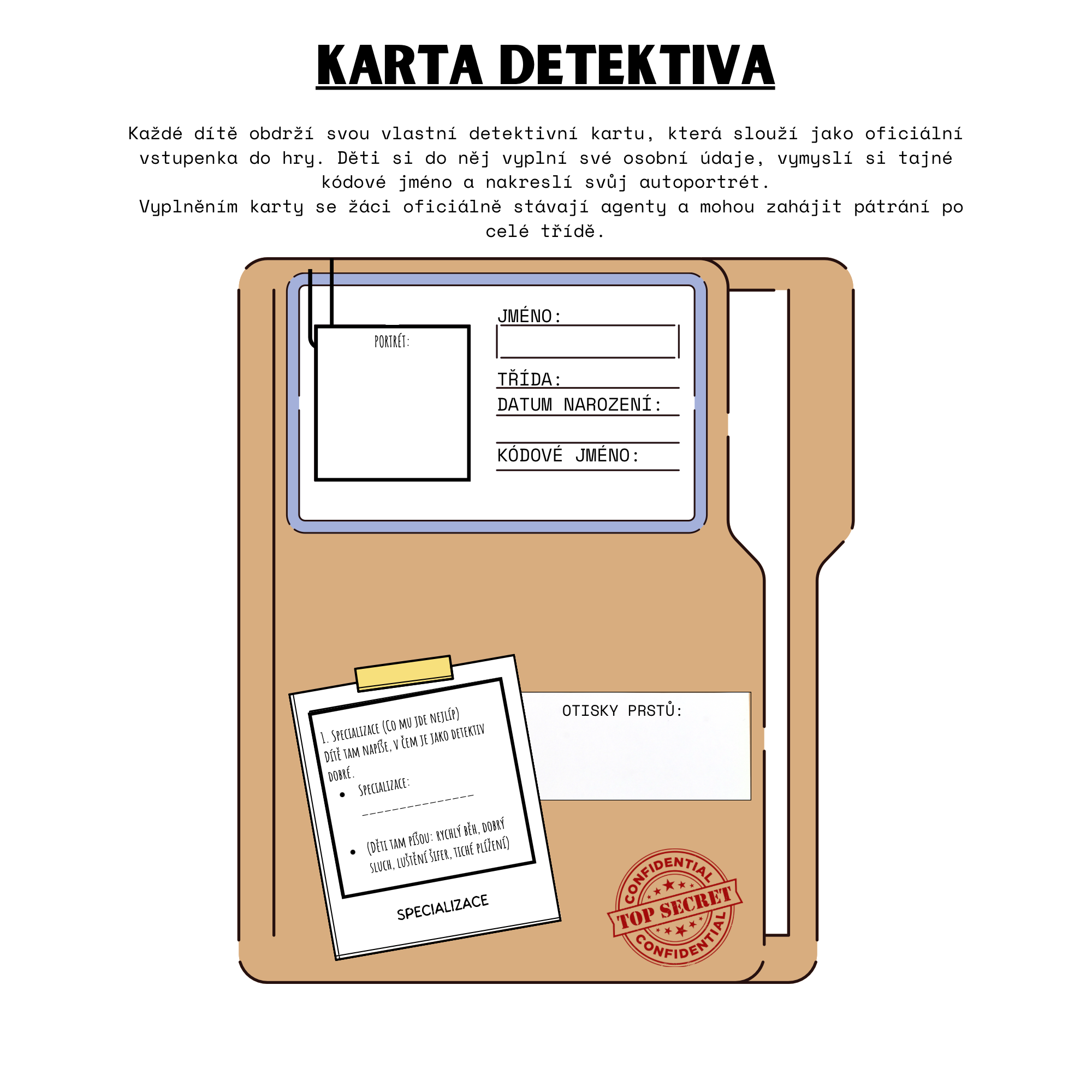 - Průkaz tajného agenta: Každý žák si vytvoří vlastní identitu včetně kódového jména a otisku prstu.